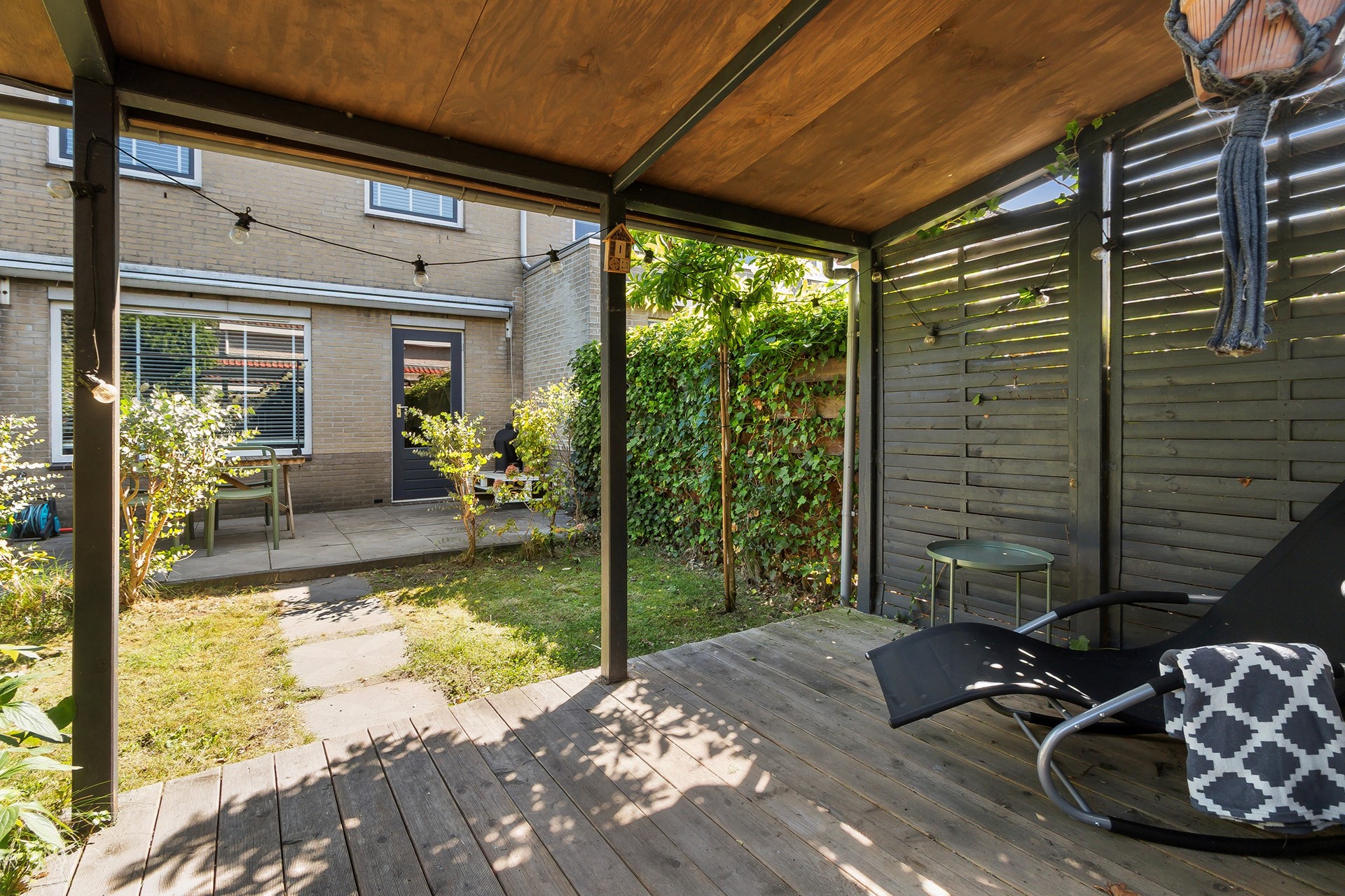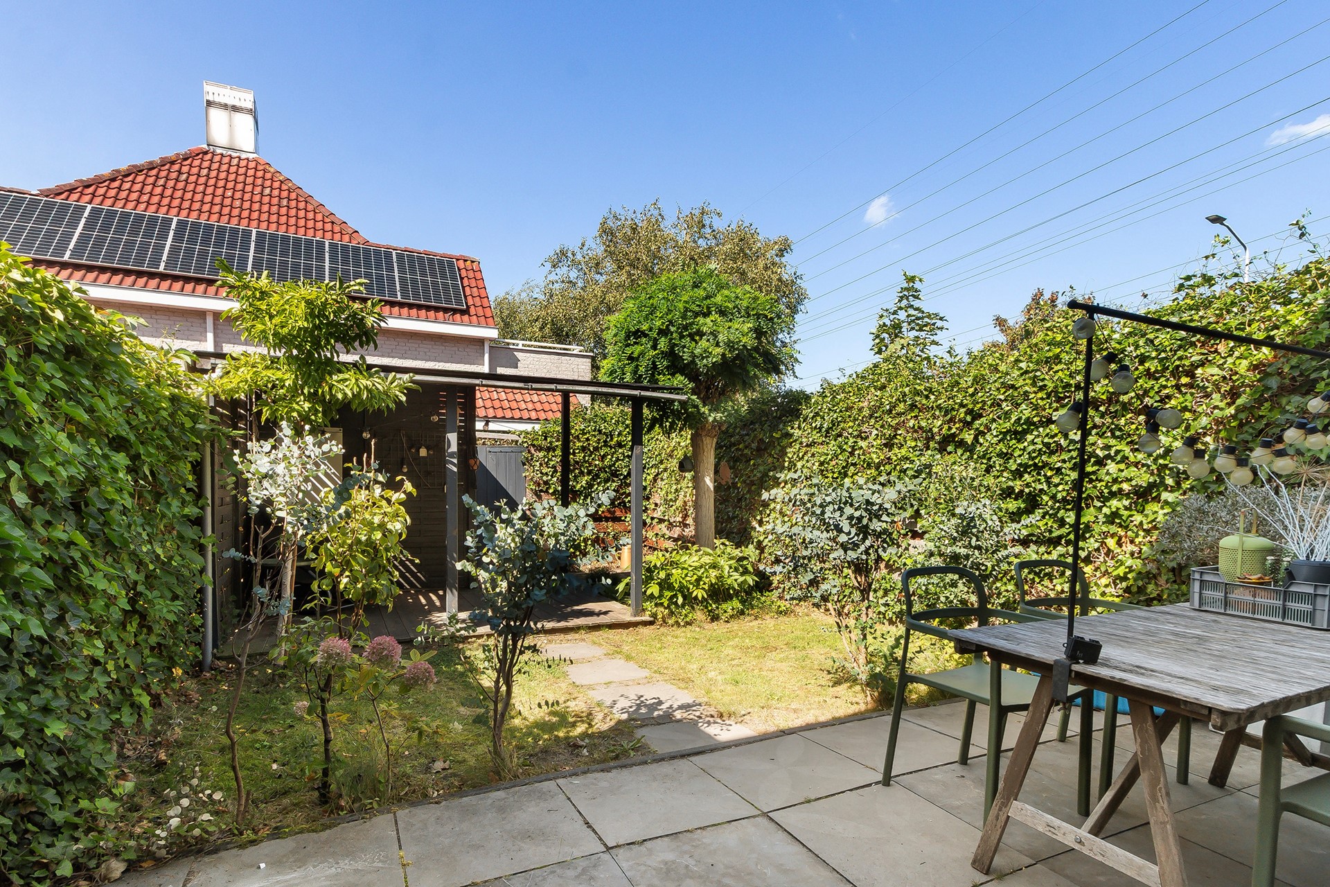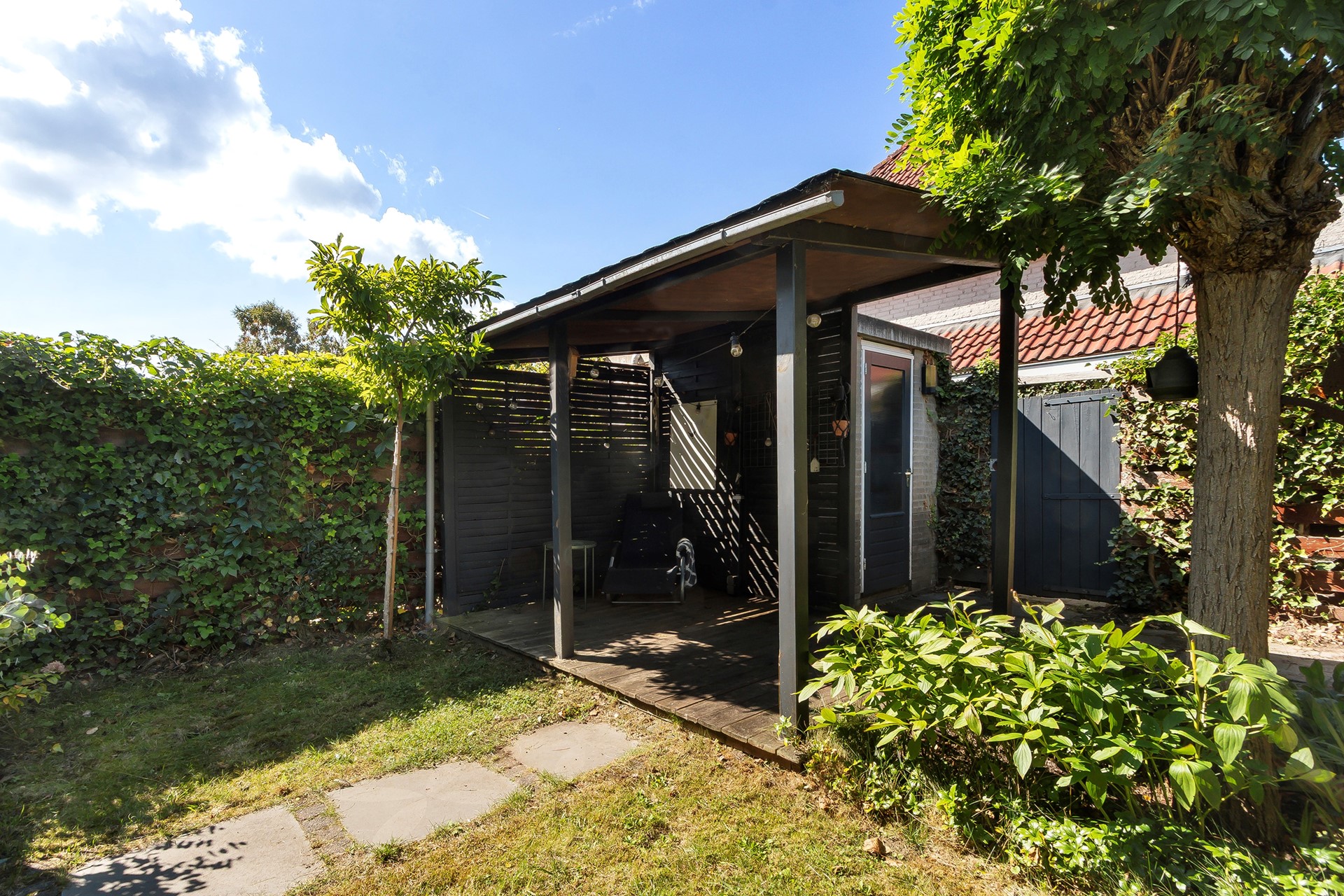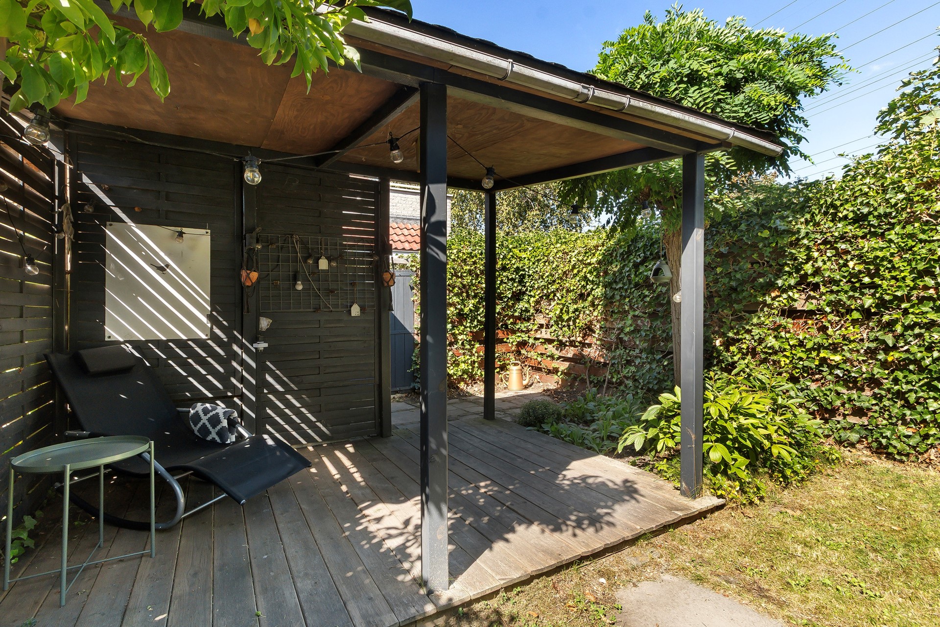 Achtertuin: De achtertuin (afm. ca. 10.30 x 5.18) is heerlijk en speels aangelegd. Je vindt er een knusse overkapping met aansluitend een berging van 4 m². Dankzij de westelijke ligging geniet je tot in de late uurtjes van de zon. De tuin is deels bestraat, maar er zijn ook diverse boompjes, gras en groenborders, waardoor de tuin een prettige, groene en natuurlijke uitstraling heeft.