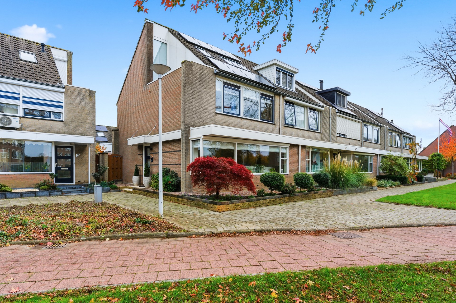 Voortuin: De voortuin (afm. ca. 2.5 x 7.00) ligt op het noordwesten en is keurig aangelegd met grint, sierbestrating en nette tuinborders. ’s Avonds zorgt de sfeervolle tuinverlichting voor een mooi aanzicht. Praktische extra’s zijn het overstek boven de deur, de screens aan de voorzijde en een beregeningssysteem.