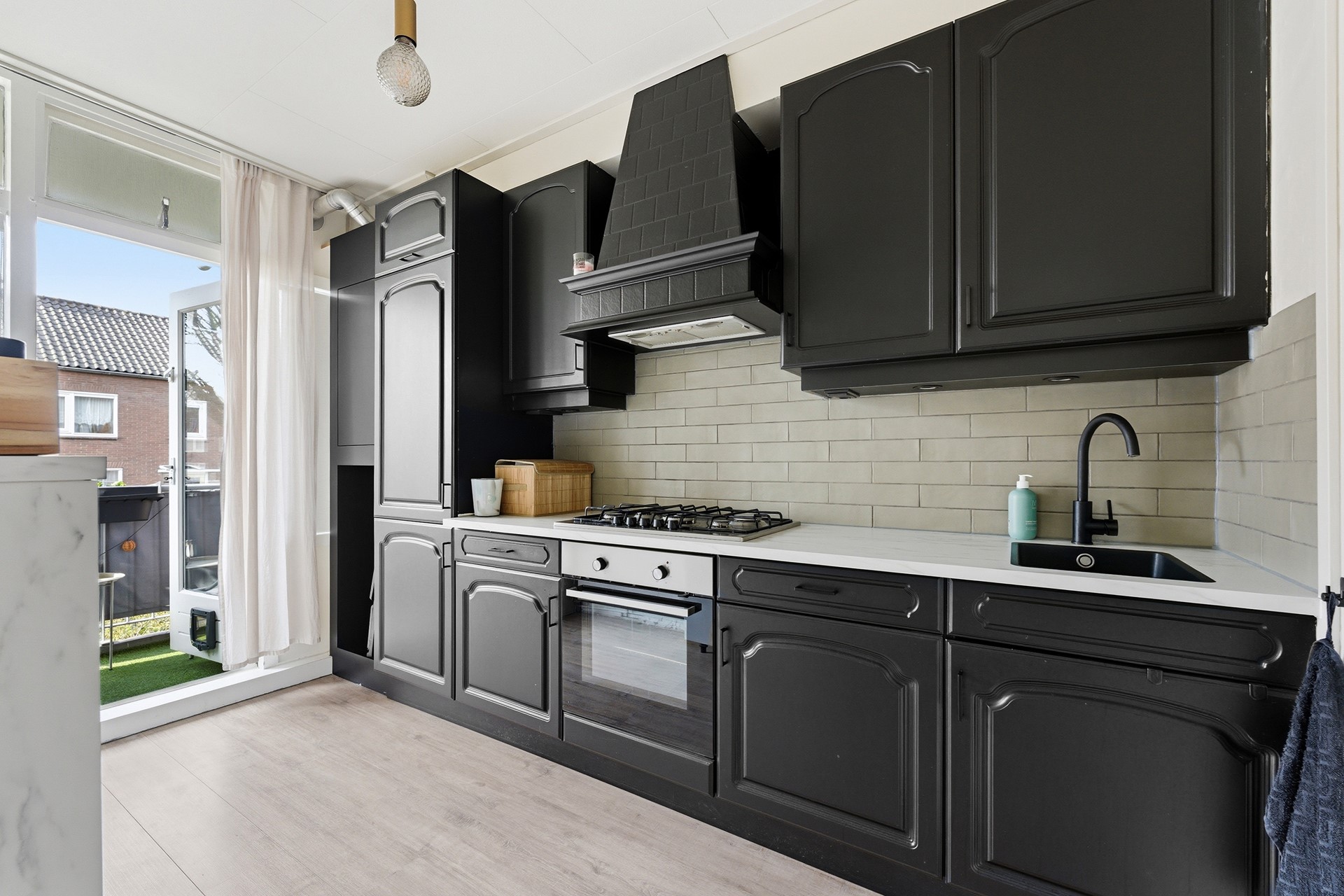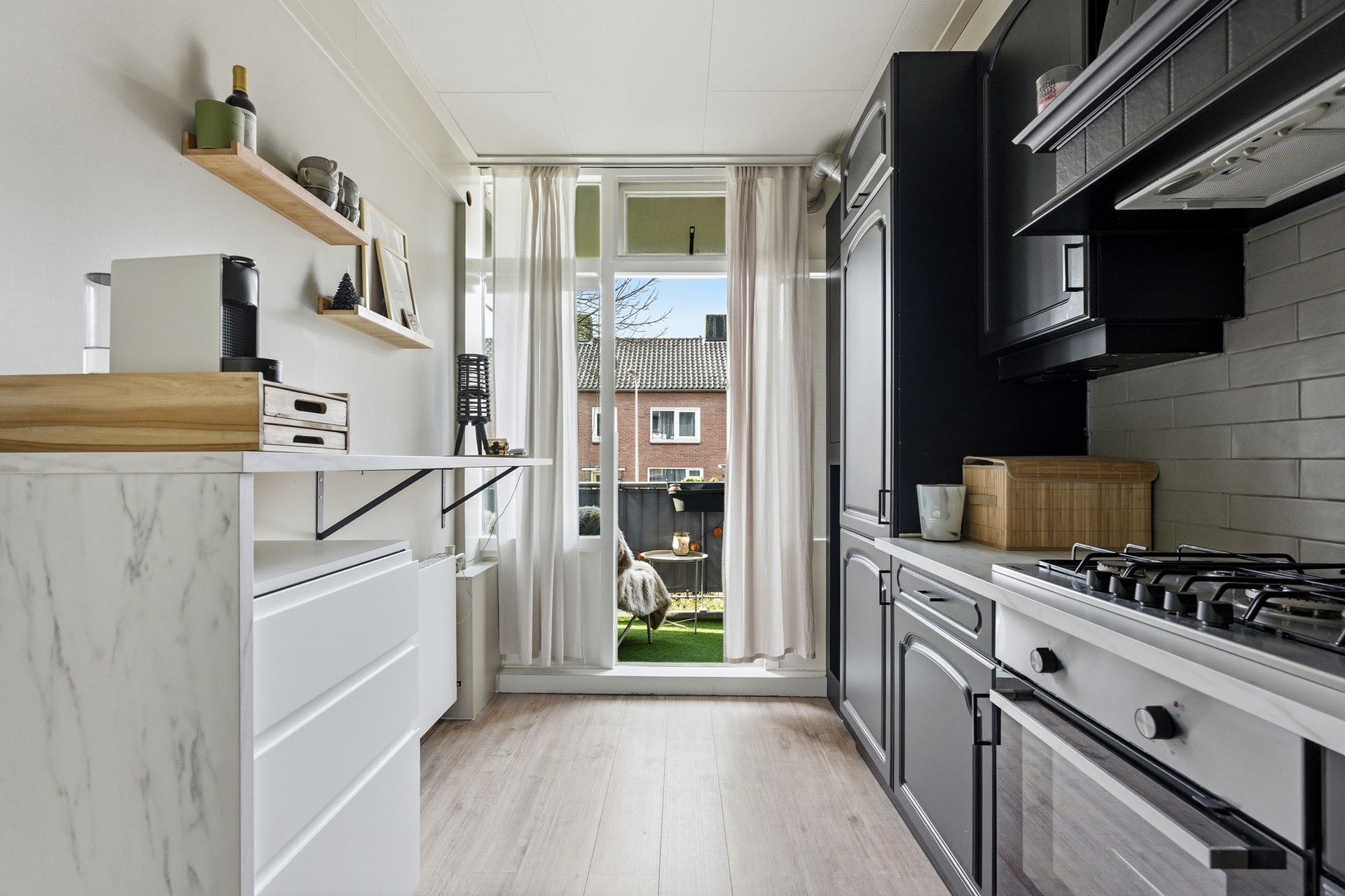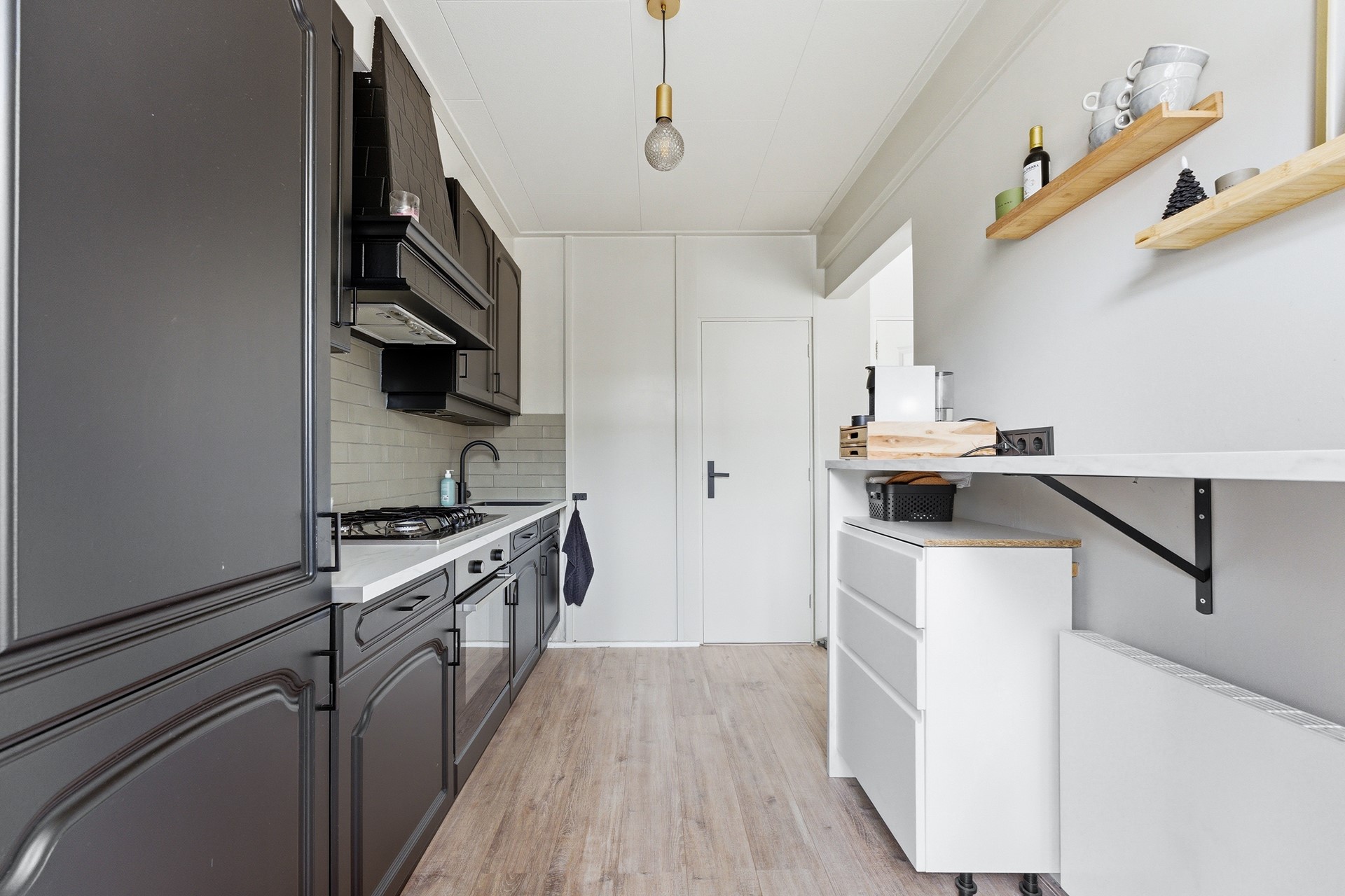 Keuken: In de gezellige, deels open keuken vind je een recht keukenblok met een vijfpits gasstel. De keuken beschikt over een praktische inbouwkast voor je voorraad en een deur naar het balkon. Ook de cv-ketel is hier netjes in een kast weggewerkt. De keuken is voorzien van een oven, koel-vriescombinatie, 5-pitsgasstel en afzuigkap. Het plafond is afgewerkt met houten delen.