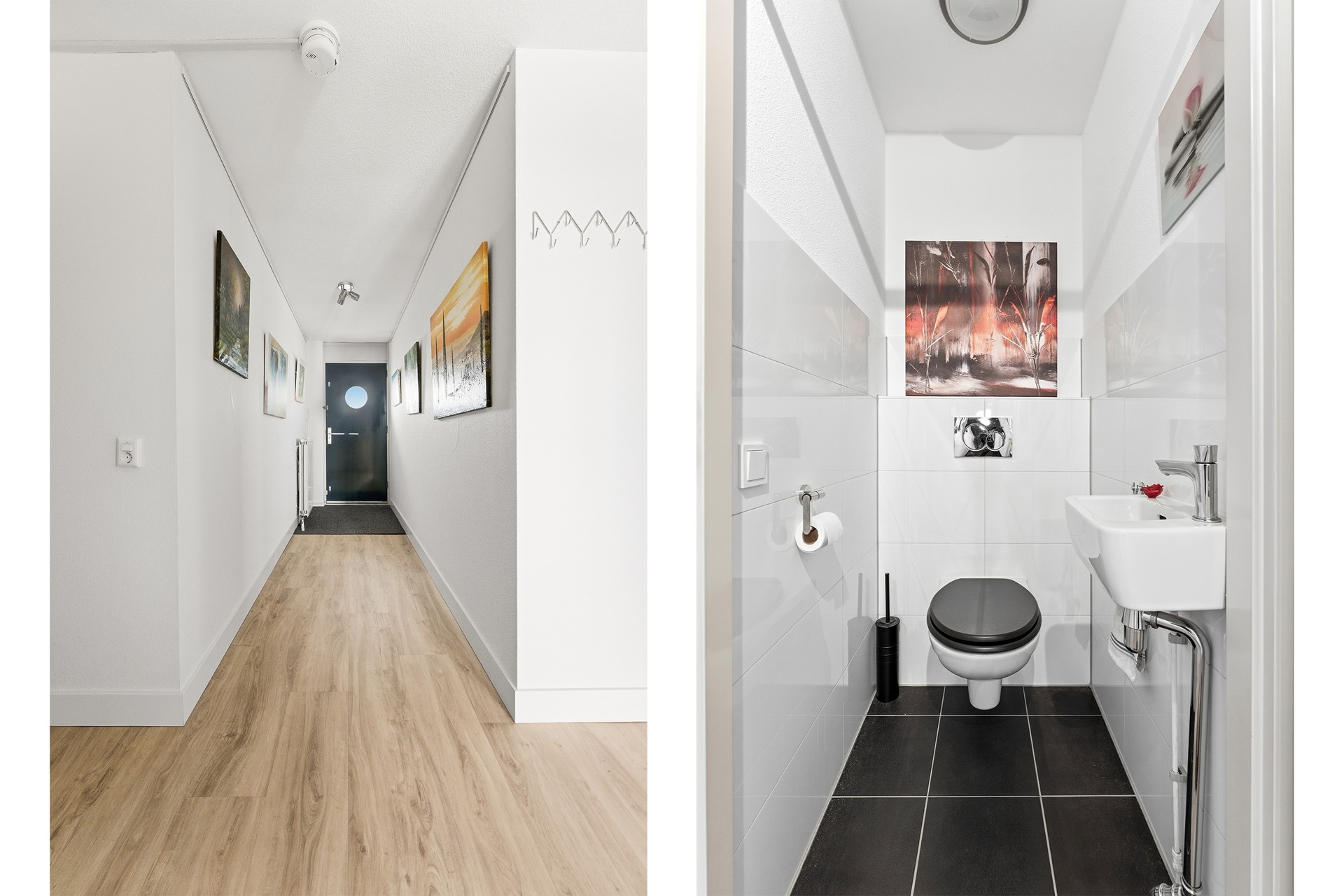 Toilet: Het separate toilet is keurig afgewerkt met zwart-witte tegels en beschikt over een zwevend toilet en een klein fonteintje. Mechanische ventilatie zorgt voor een aangename luchtcirculatie.