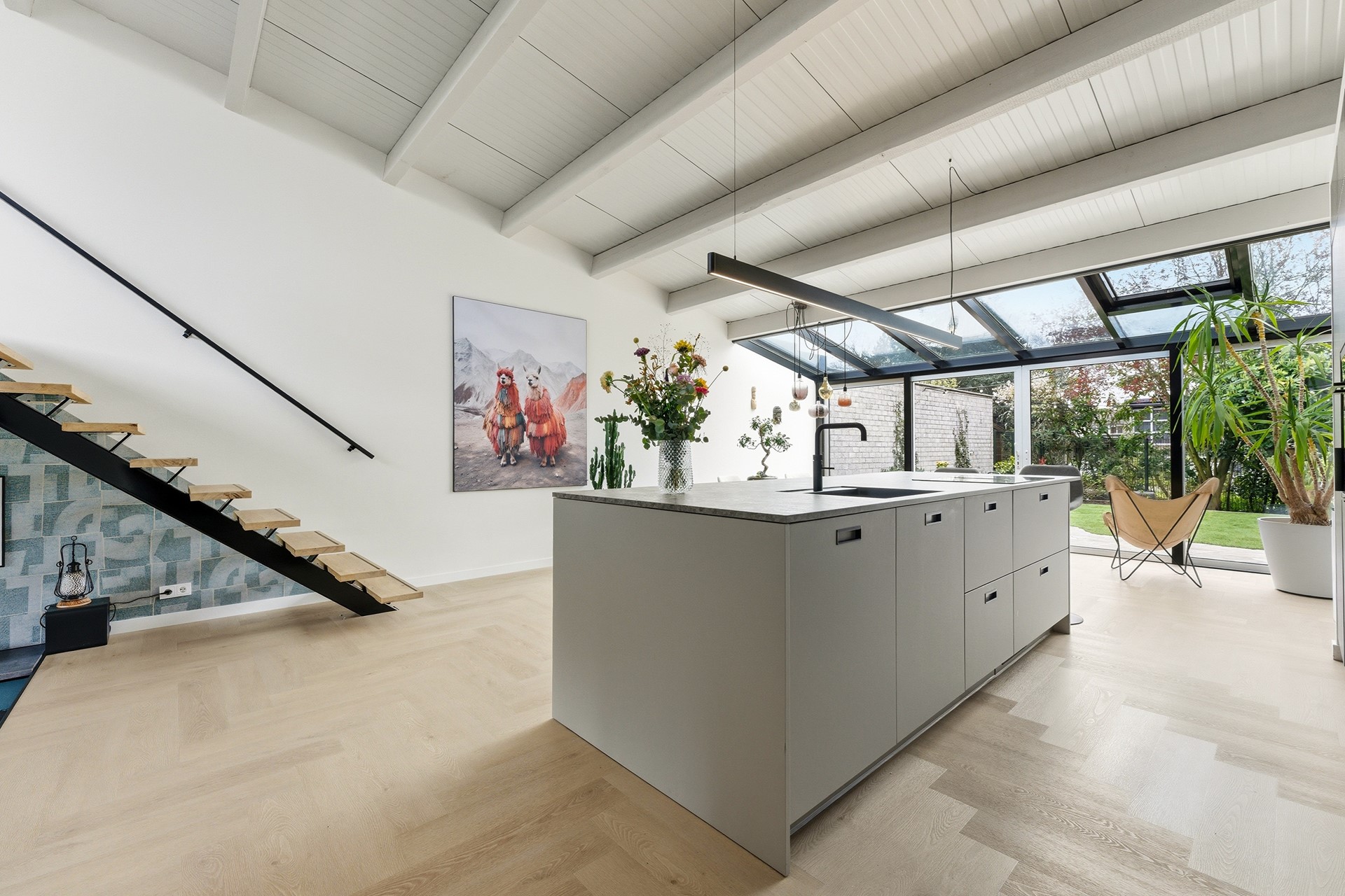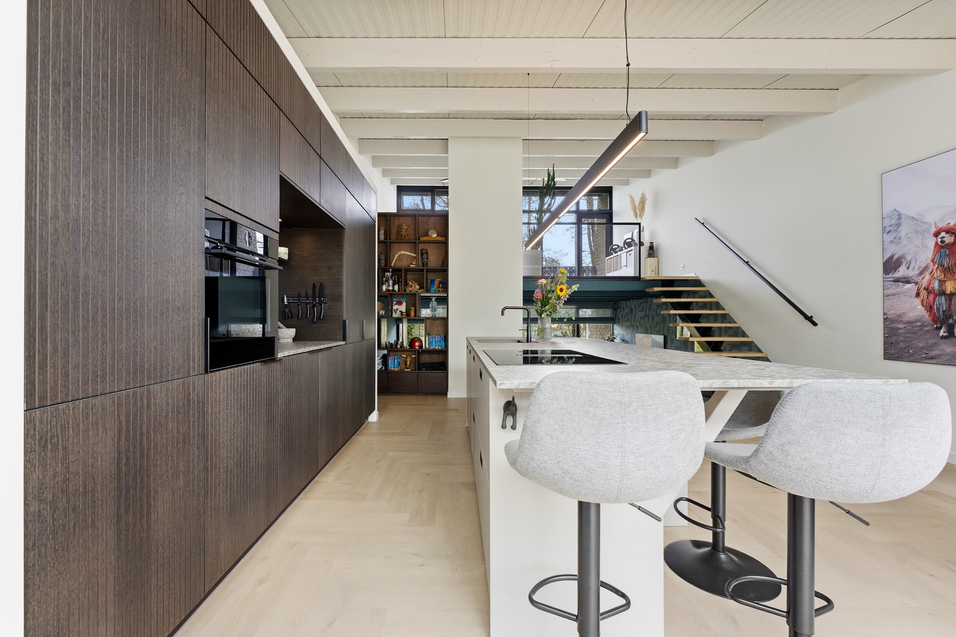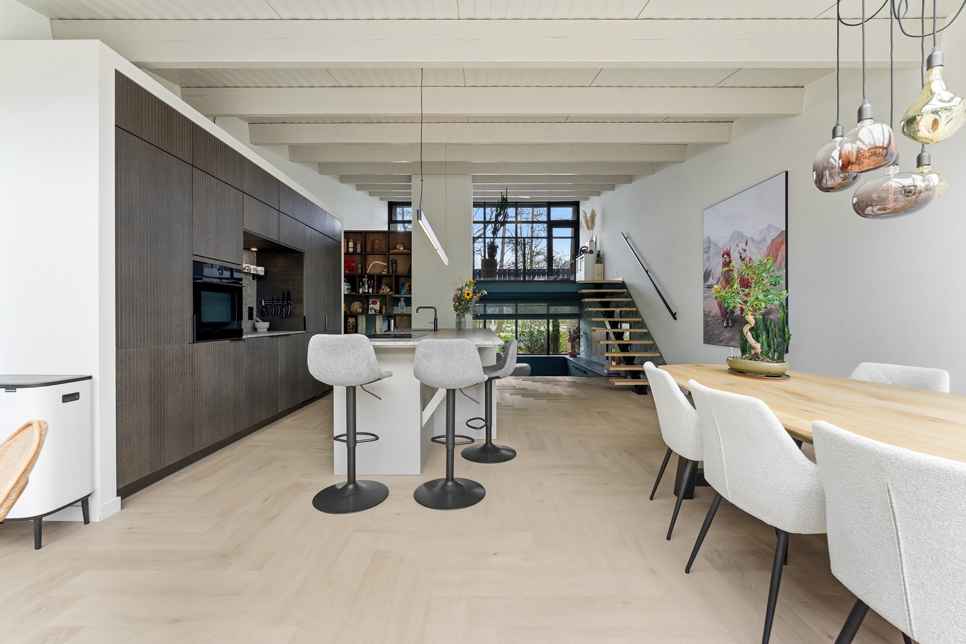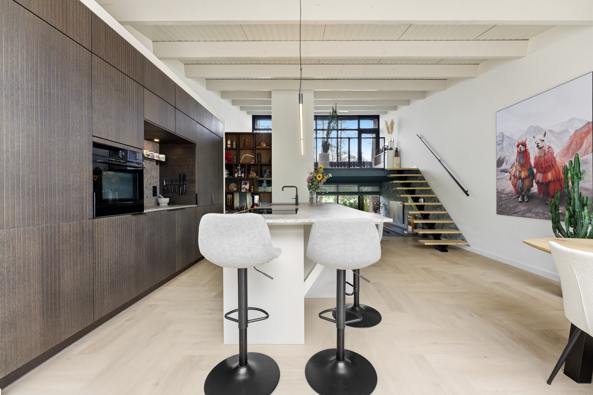 Keuken: De open keuken is uitgevoerd met een groot kookeiland en een koffienis, wat zorgt voor een moderne en luxe uitstraling. De keuken is compleet uitgerust met een inductiekookplaat met geïntegreerde afzuiging, een Quooker, een elektrische boiler, een oven, vaatwasser, koelkast en vriezer. Dankzij de vele ramen valt er prettig licht op het werkblad. De afwerking bestaat uit strak gestuukte wanden en een drempelloos doorgelegde PVC-vloer met vloerverwarming.
