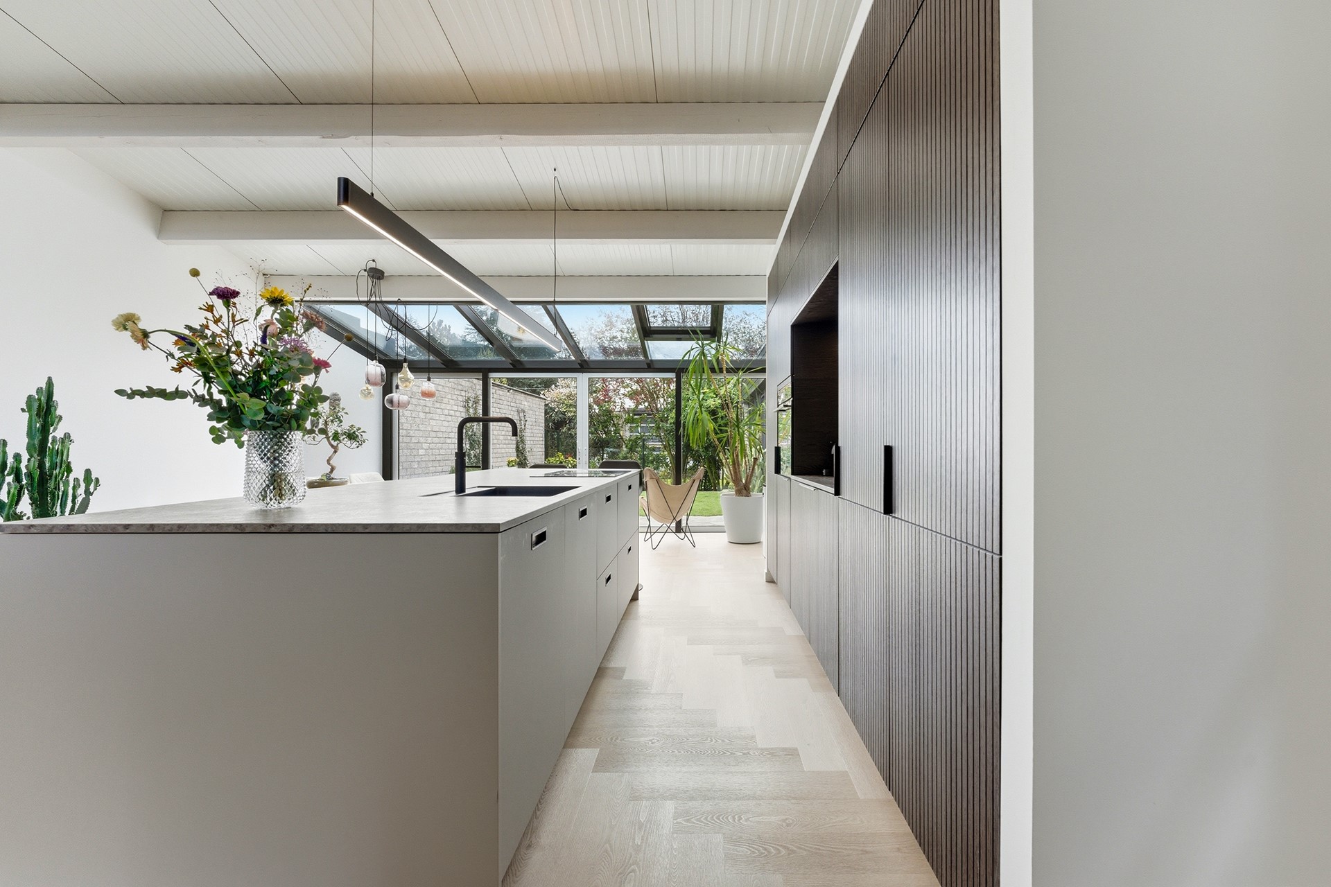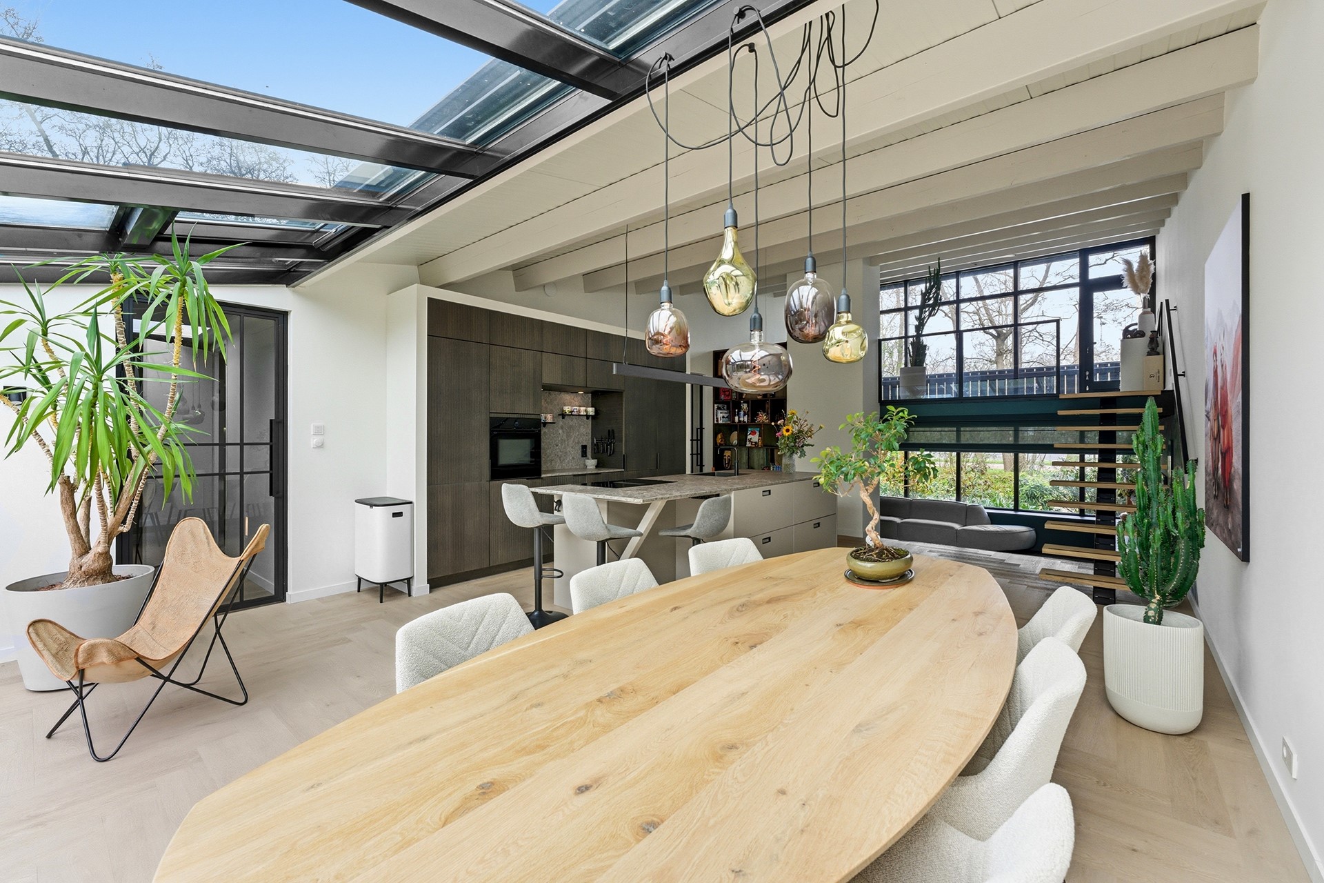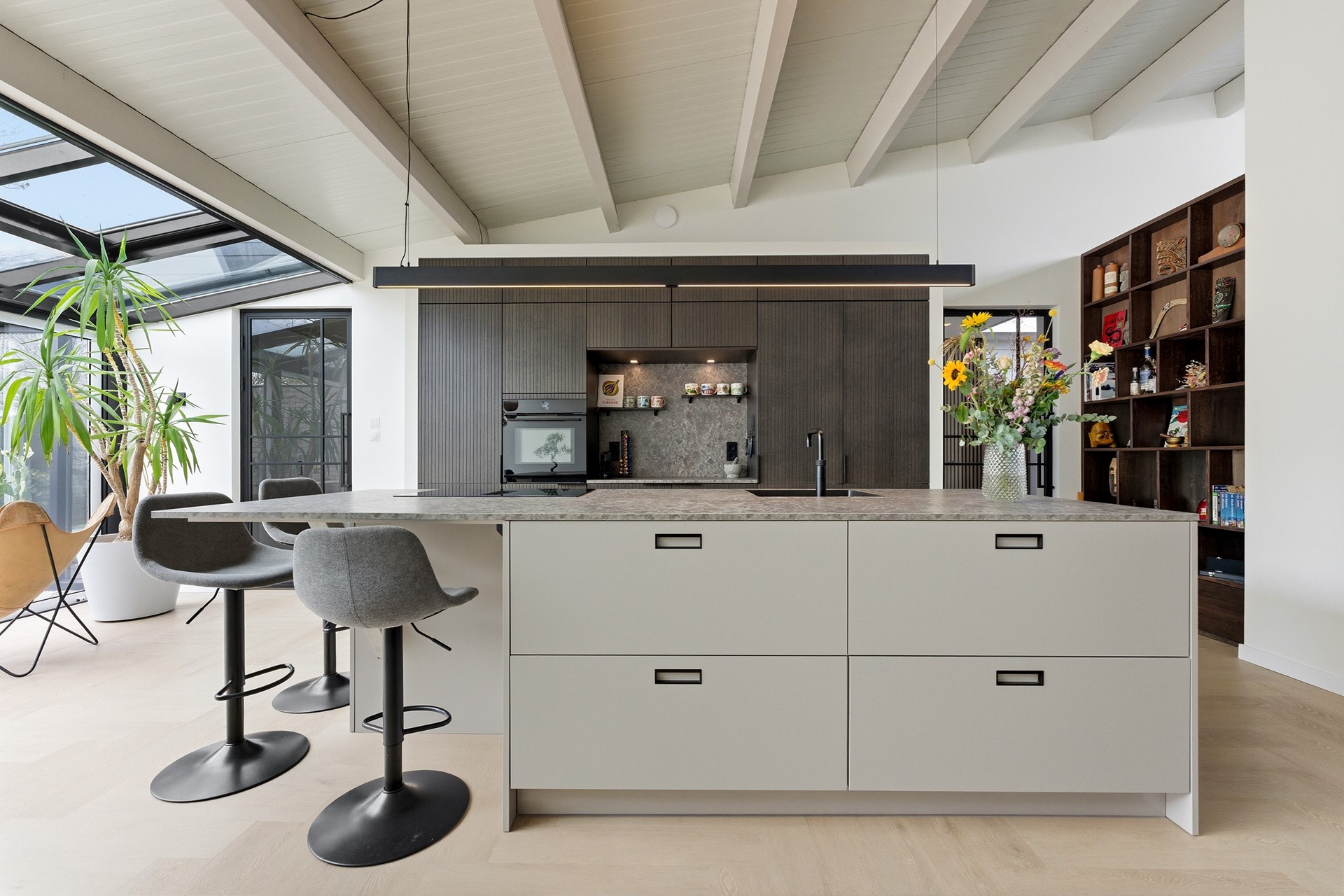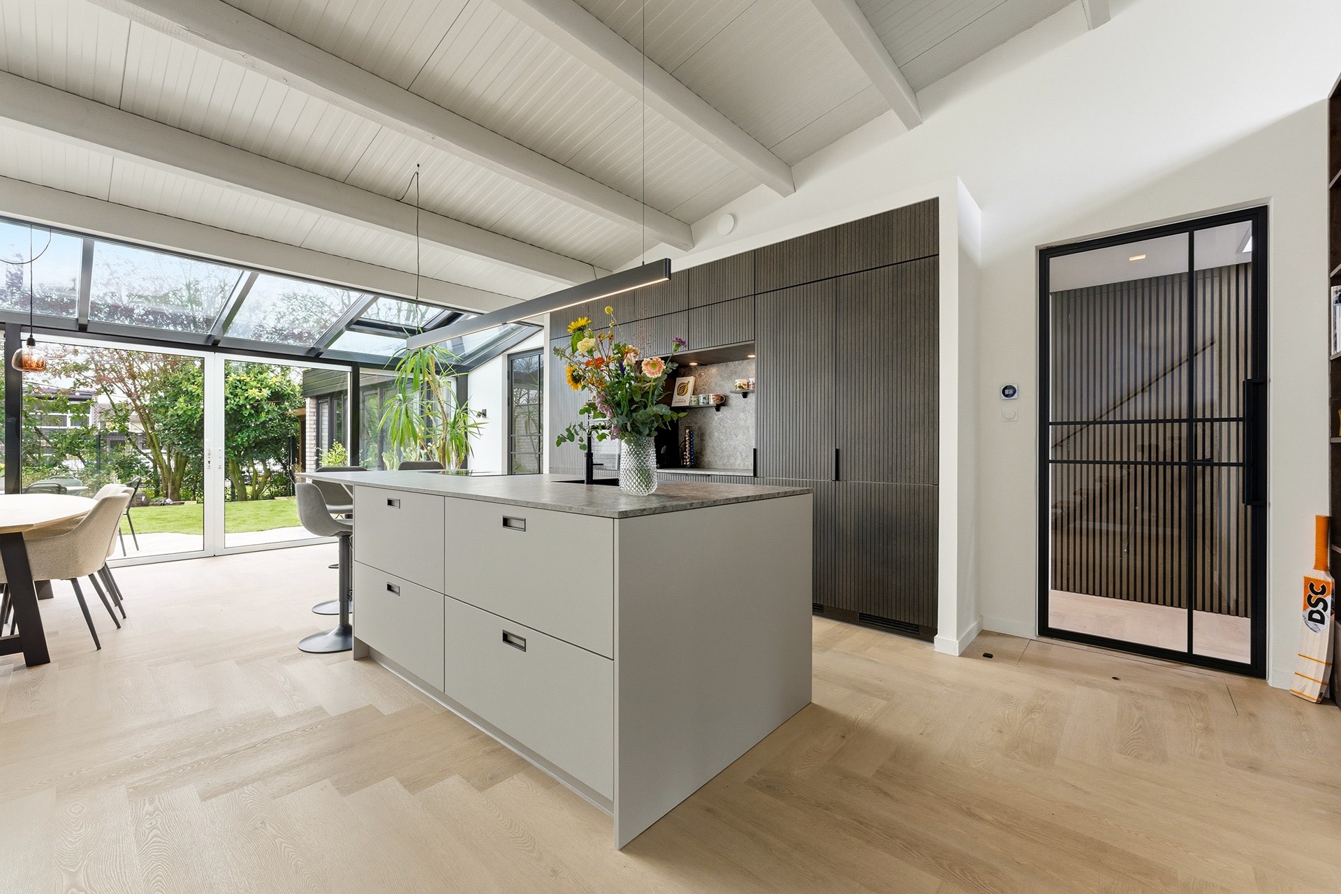 Keuken: De open keuken is uitgevoerd met een groot kookeiland en een koffienis, wat zorgt voor een moderne en luxe uitstraling. De keuken is compleet uitgerust met een inductiekookplaat met geïntegreerde afzuiging, een Quooker, een elektrische boiler, een oven, vaatwasser, koelkast en vriezer. Dankzij de vele ramen valt er prettig licht op het werkblad. De afwerking bestaat uit strak gestuukte wanden en een drempelloos doorgelegde PVC-vloer met vloerverwarming.