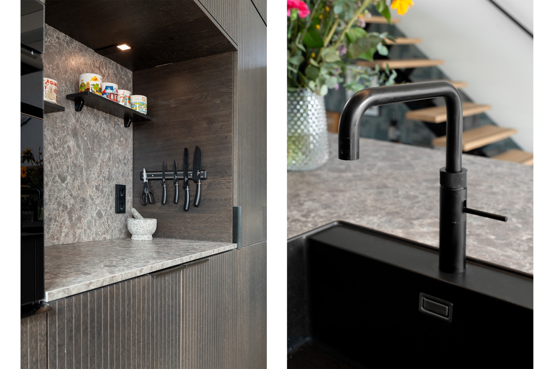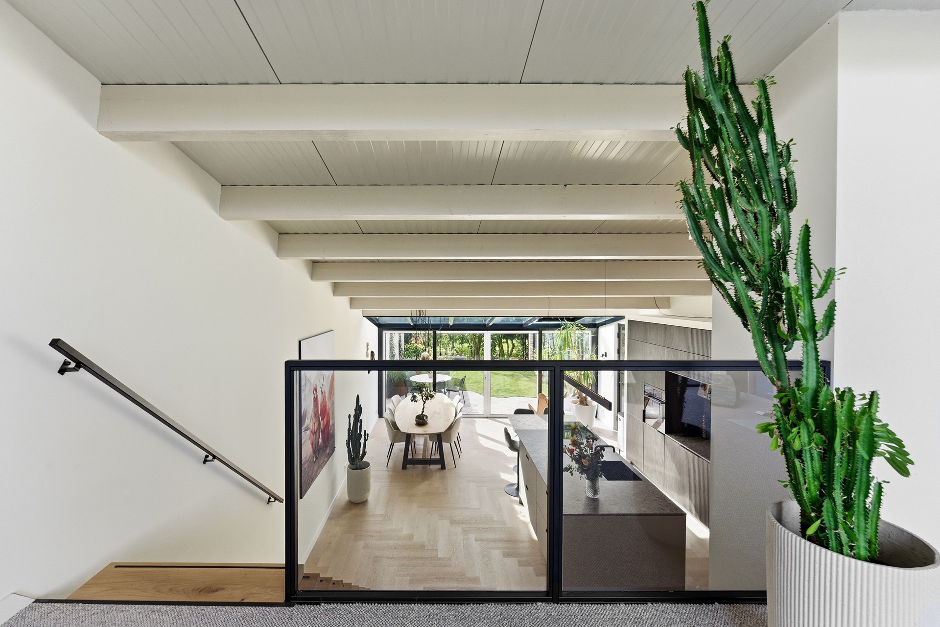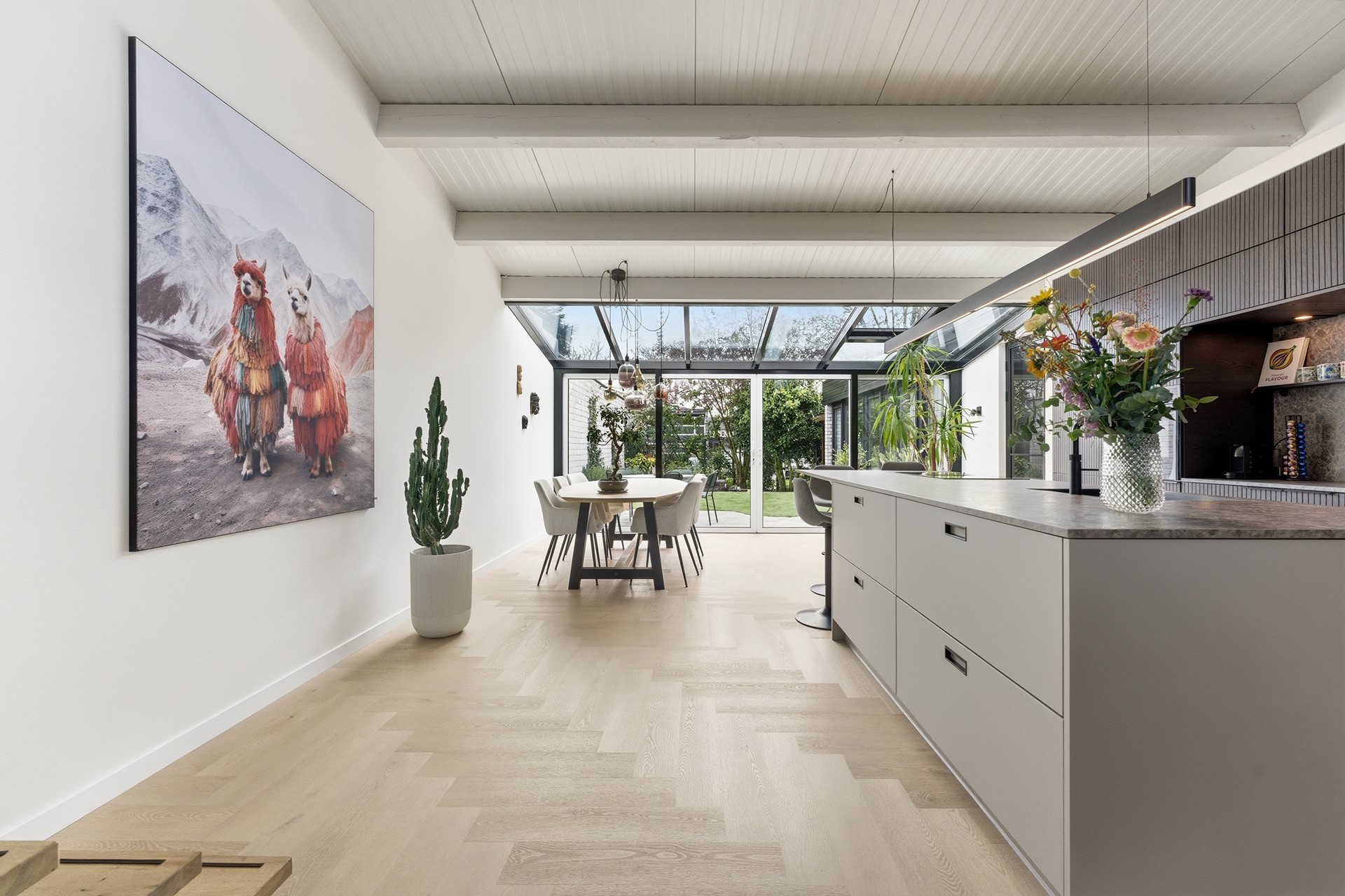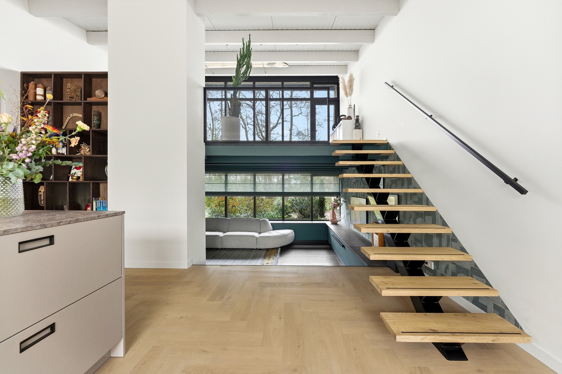 Keuken: De open keuken is uitgevoerd met een groot kookeiland en een koffienis, wat zorgt voor een moderne en luxe uitstraling. De keuken is compleet uitgerust met een inductiekookplaat met geïntegreerde afzuiging, een Quooker, een elektrische boiler, een oven, vaatwasser, koelkast en vriezer. Dankzij de vele ramen valt er prettig licht op het werkblad. De afwerking bestaat uit strak gestuukte wanden en een drempelloos doorgelegde PVC-vloer met vloerverwarming.