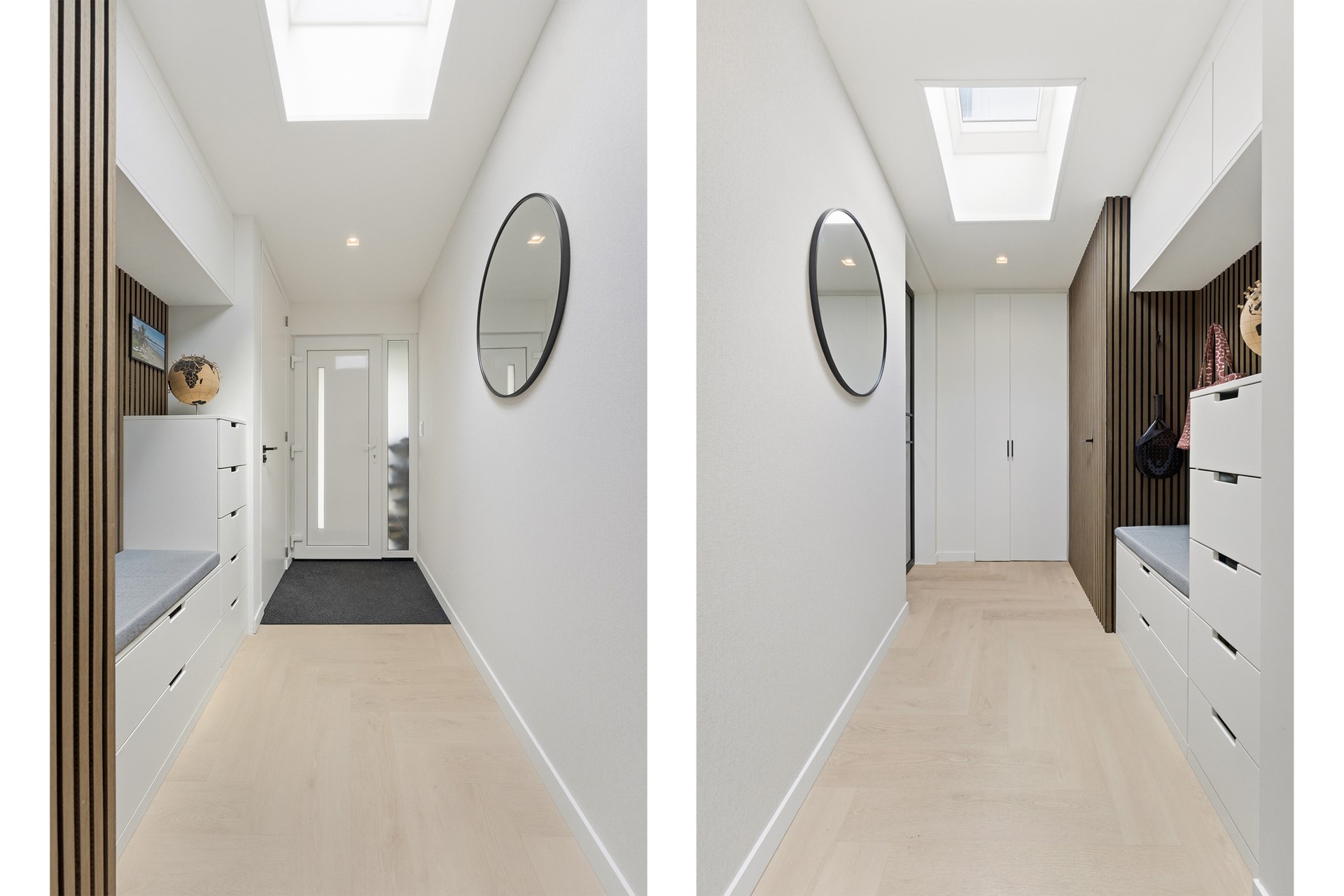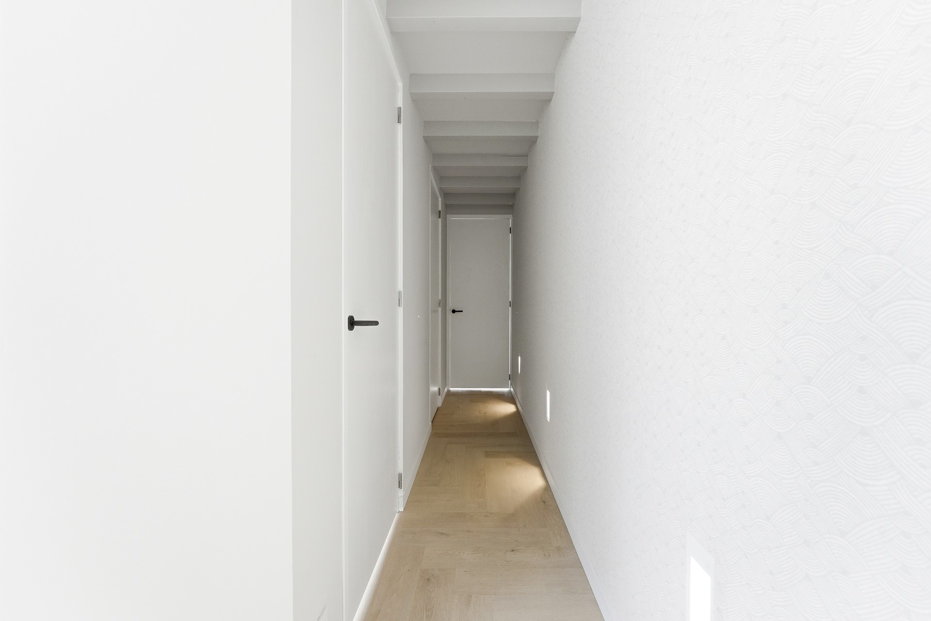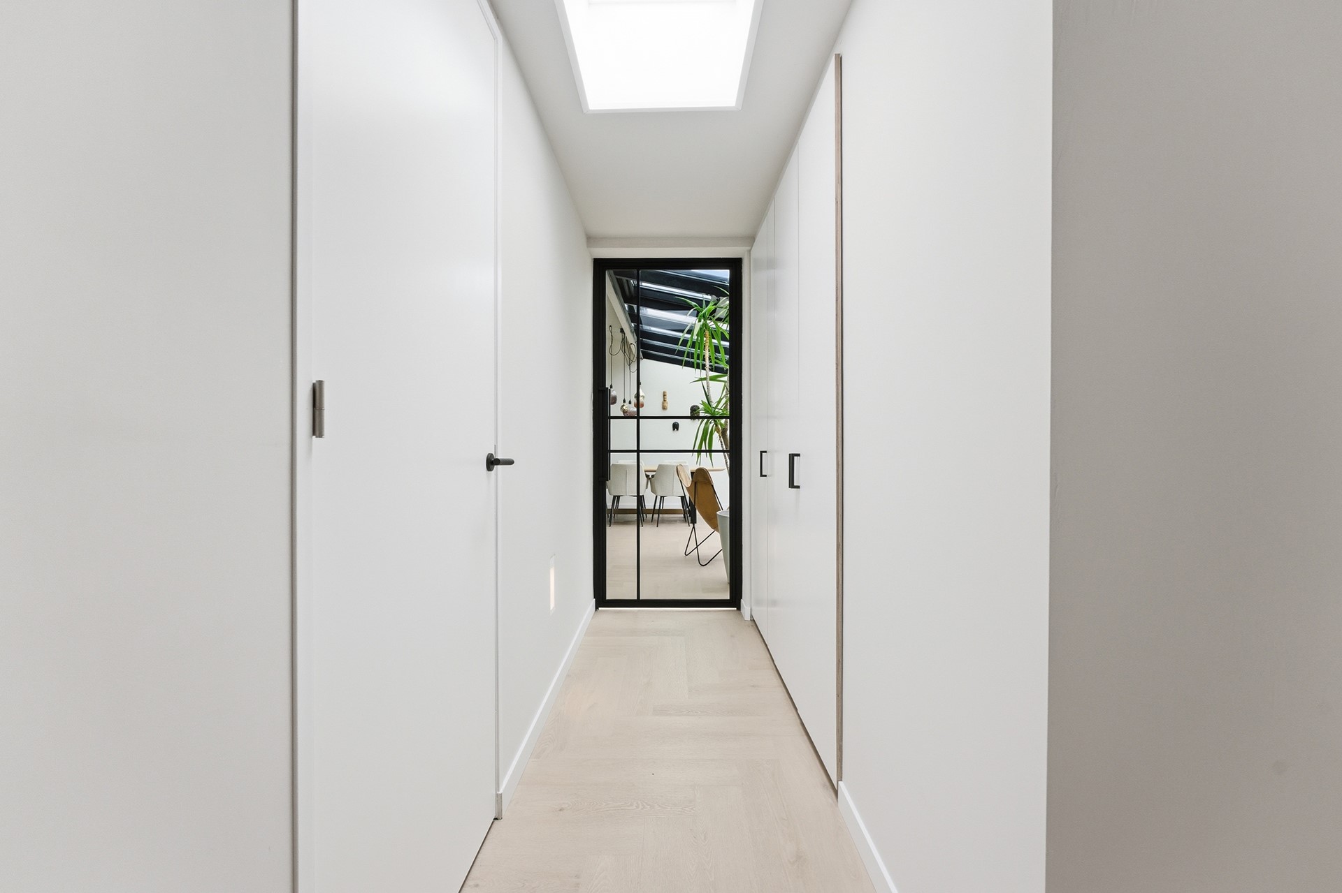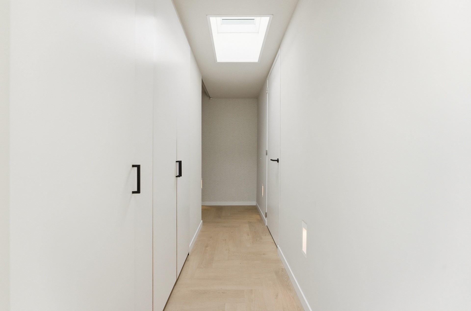 Gang: De lange gang op de begane grond verbindt de verschillende vertrekken en benadrukt het levensloopbestendige karakter. Meerdere inbouwkasten bieden extra bergruimte en een dakraam zorgt voor natuurlijk daglicht. De overloop geeft toegang tot de badkamer en de twee slaapkamers en is volledig voorzien van vloerverwarming.