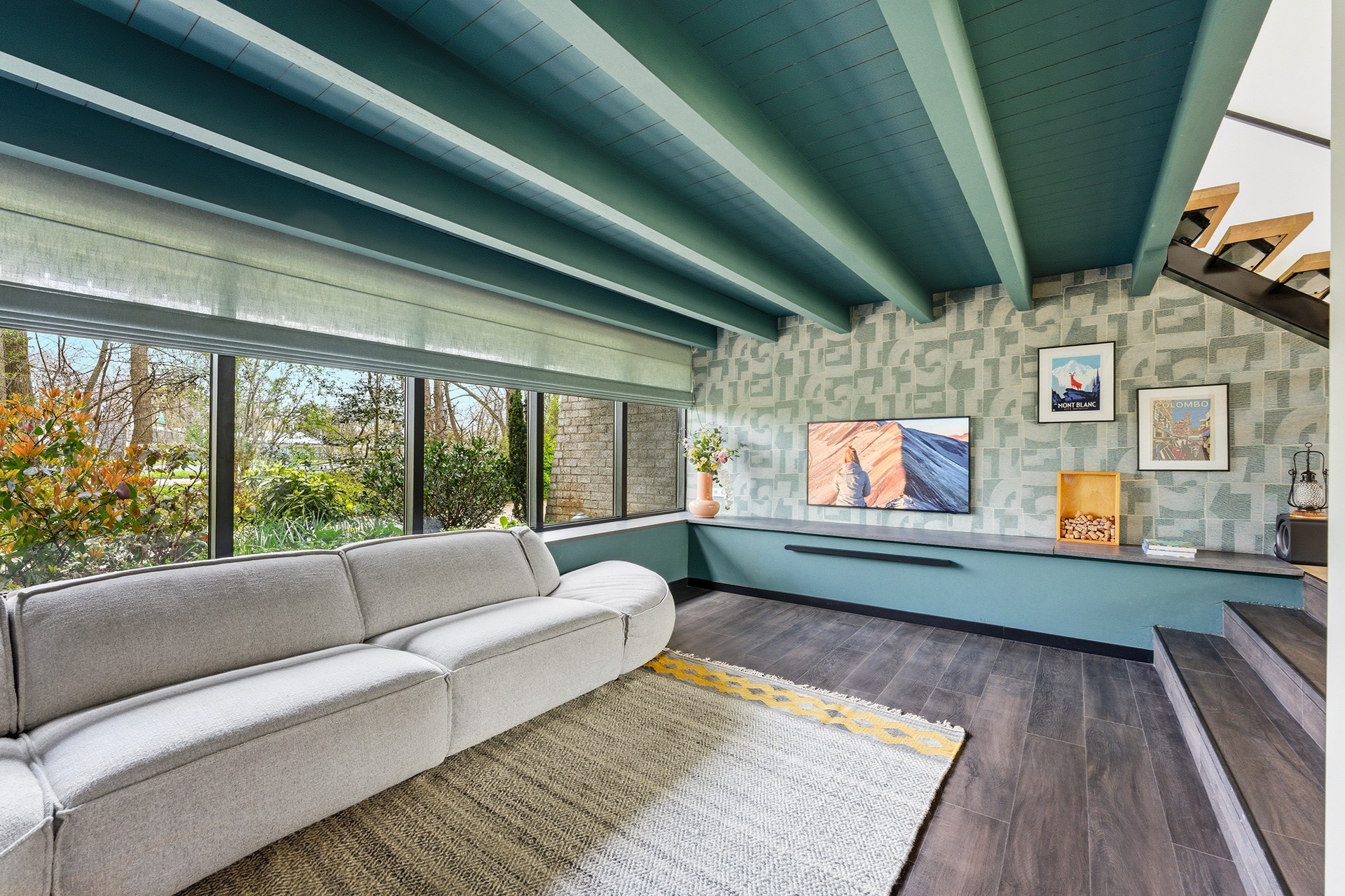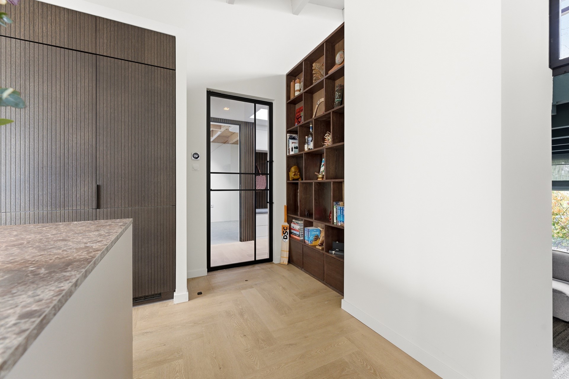 Entree: De lichte hal biedt een verzorgde binnenkomst en is voorzien van een dakraam en een praktische inbouwkast. De wanden zijn afgewerkt met behang en stijlvolle akoestische panelen waarin een deur subtiel is verwerkt. Vanuit de hal is er toegang tot de toiletruimte, de berging, de meterkast en de woonkamer. De vloer is afgewerkt met hoogwaardig PVC voorzien van vloerverwarming.
