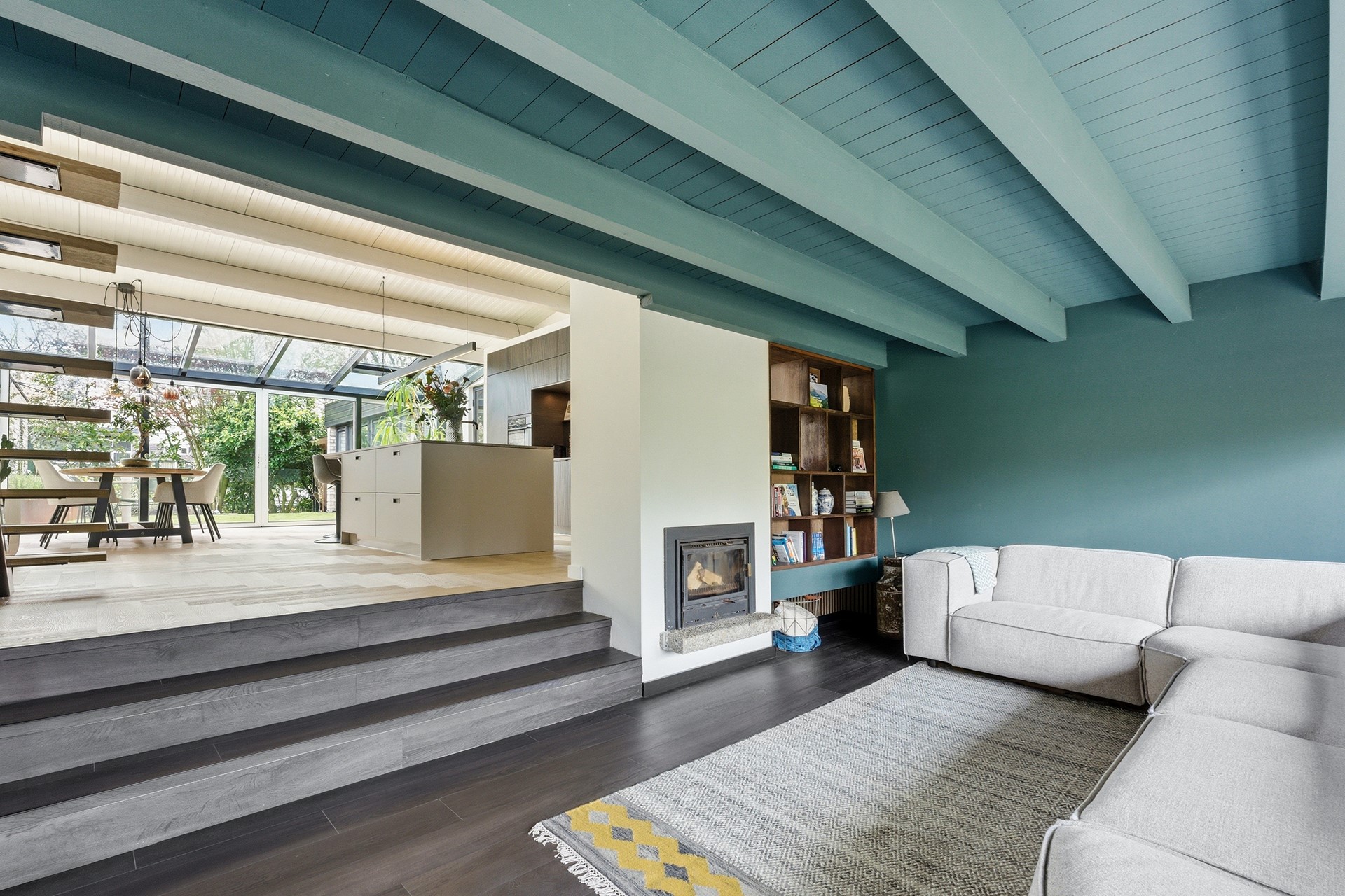 Woonkamer: De ruime woonkamer met vide heeft een speelse indeling door de aanwezigheid van een serre en een verlaagde zitkuil. In de zitkuil zorgt de houtkachel met automatische ventilatoren voor extra warmte en sfeer. De grote schuifpui aan de achterzijde zorgt voor een open verbinding met de tuin. De gehele ruimte, inclusief de zitkuil, is voorzien van vloerverwarming en strak gestuukte wanden.