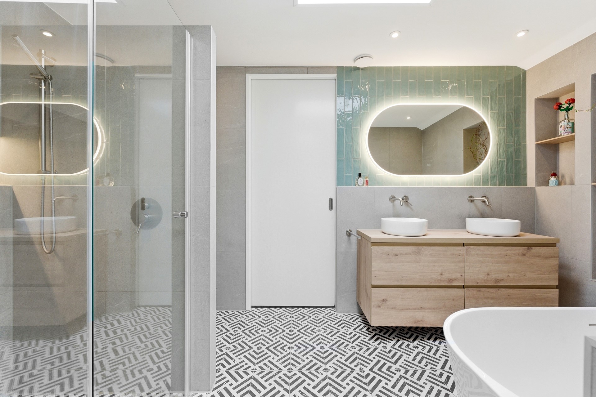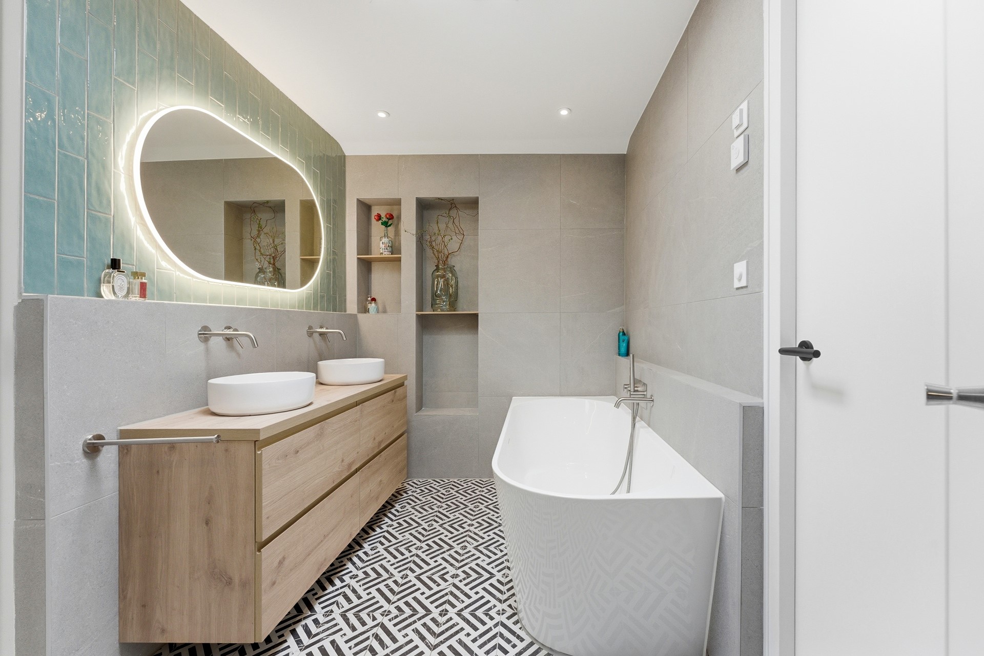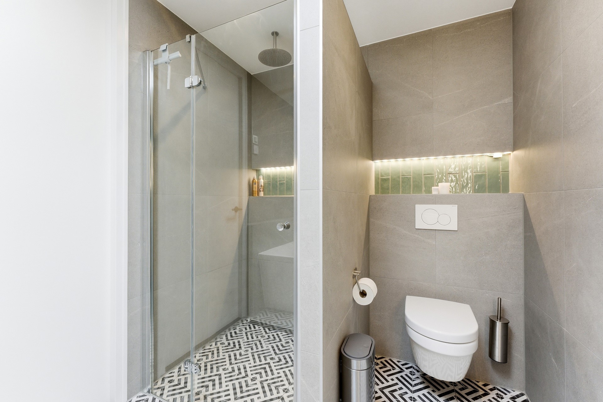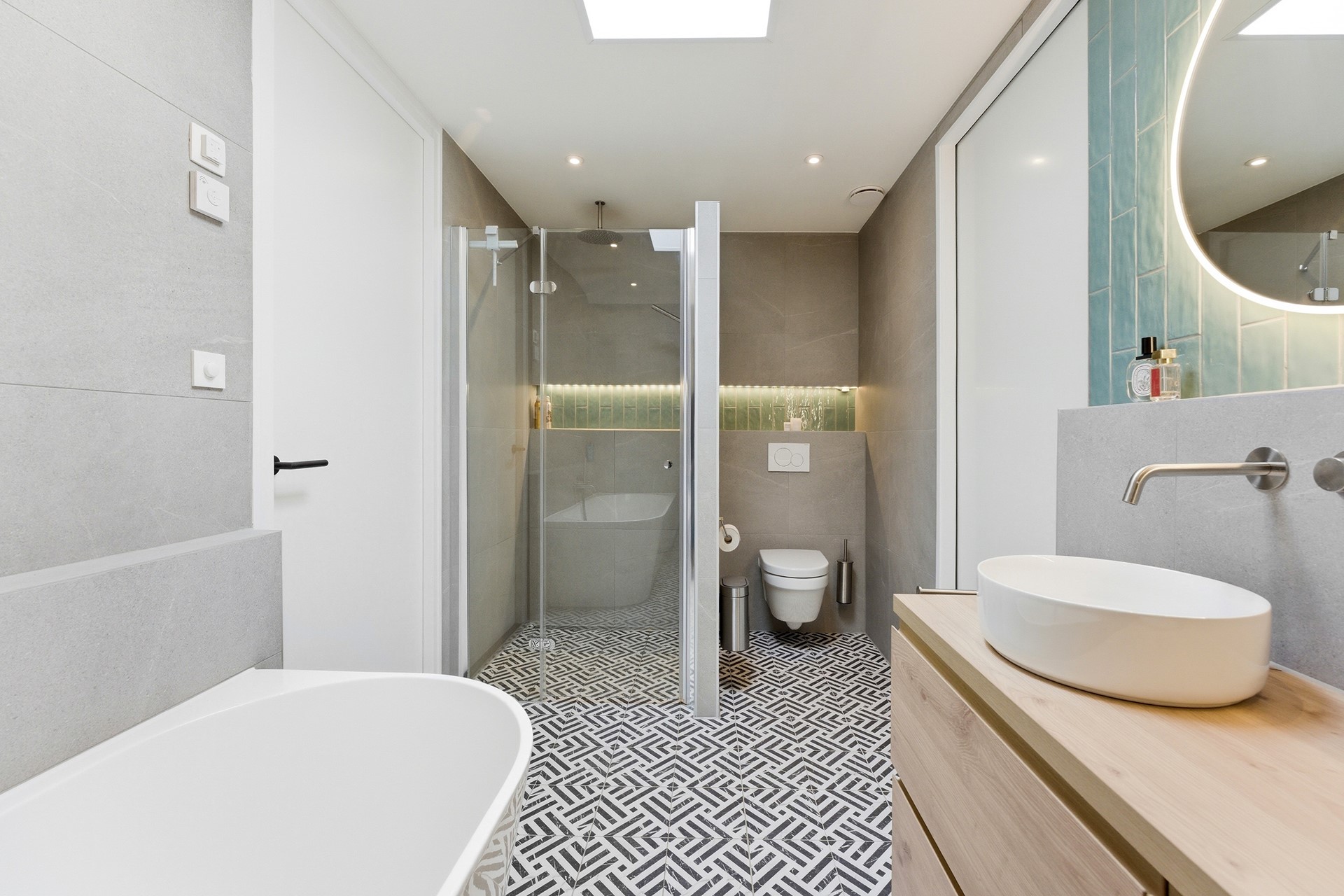 Badkamer: De luxe badkamer is volledig betegeld en ingericht met een ligbad, een inloopdouche en een meubel met dubbele waskom. De ruimte beschikt over een elektrisch bedienbaar dakraam met regensensor, vloerverwarming en sfeervol verlichte nisjes. Tevens is er een tweede zwevend toilet en mechanische ventilatie aanwezig voor optimaal comfort.