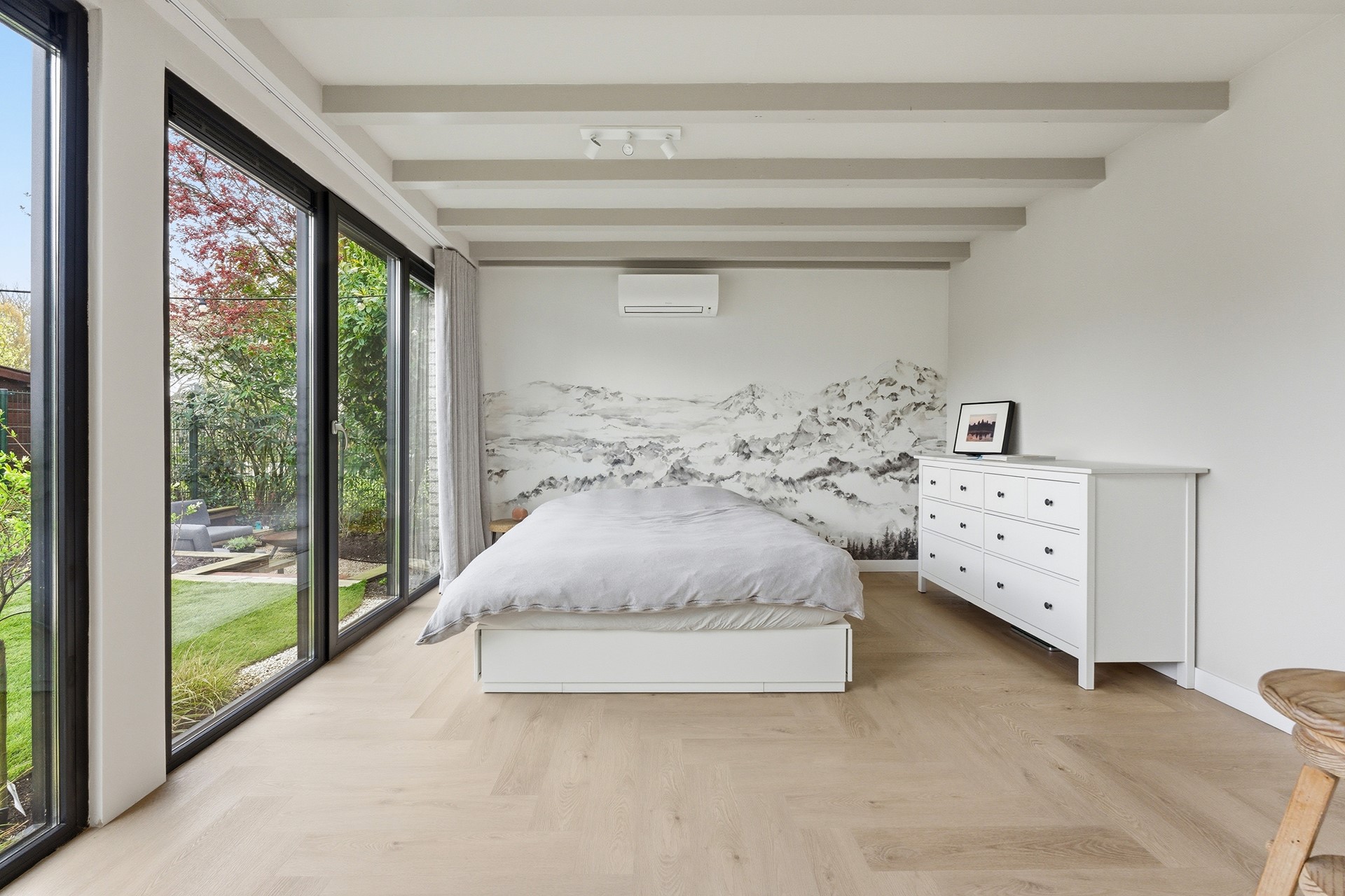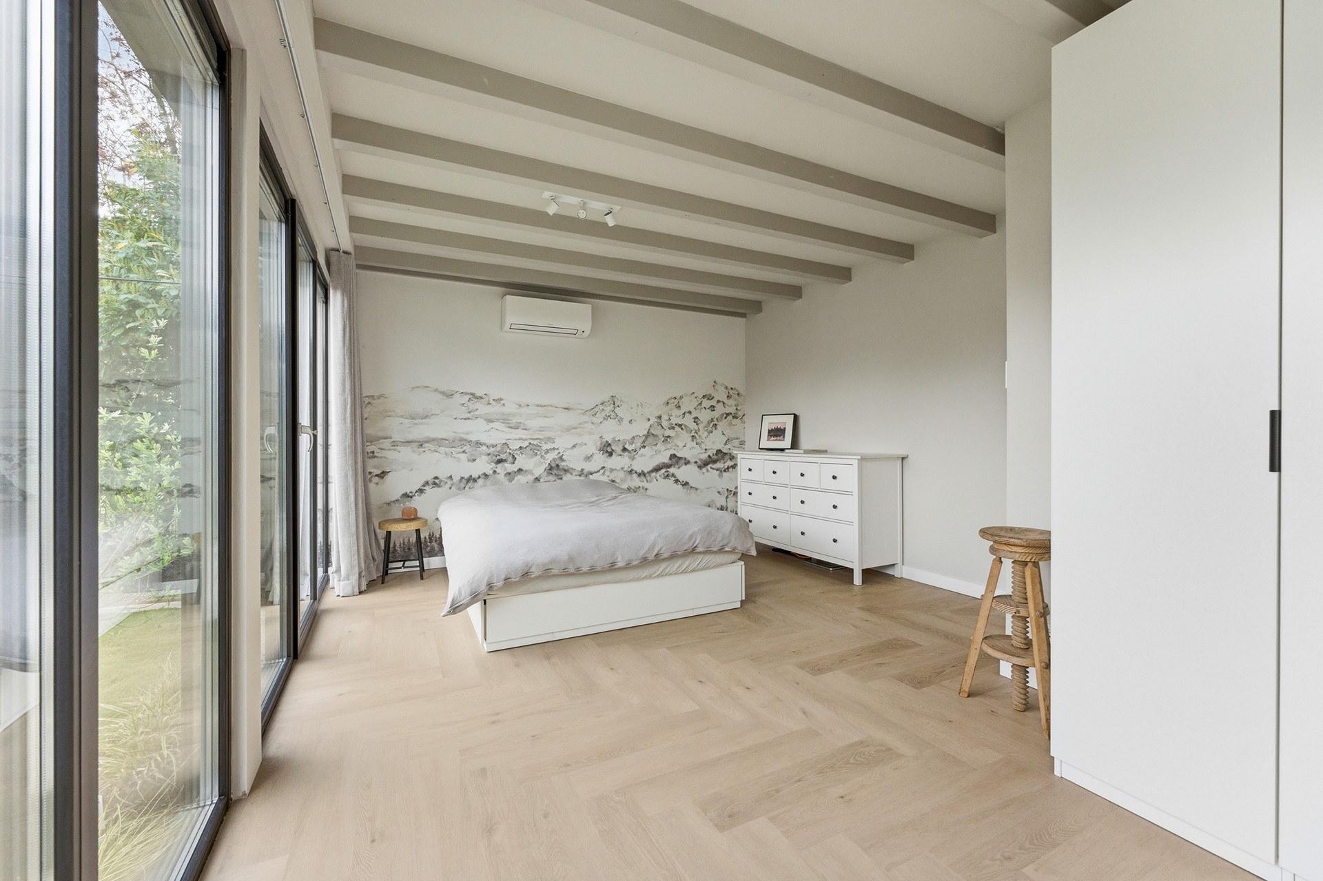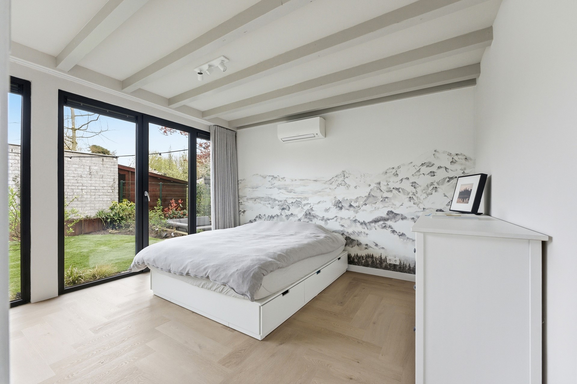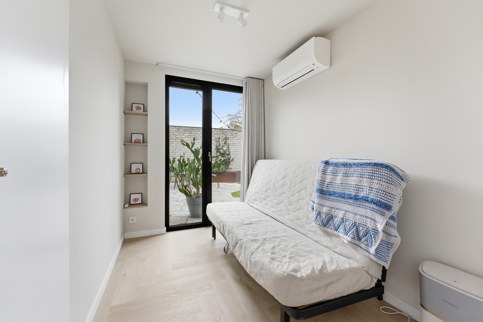 Slaapkamer 1: Deze slaapkamer is gelegen op de begane grond en beschikt over een praktische inbouwkast en airconditioning voor een optimaal slaapklimaat. Via een loopdeur is er direct toegang tot de achtertuin voor een heerlijk binnen-buitengevoel. De kamer is voorzien van kunststof kozijnen met triple beglazing (HR+++) voor maximale isolatie.