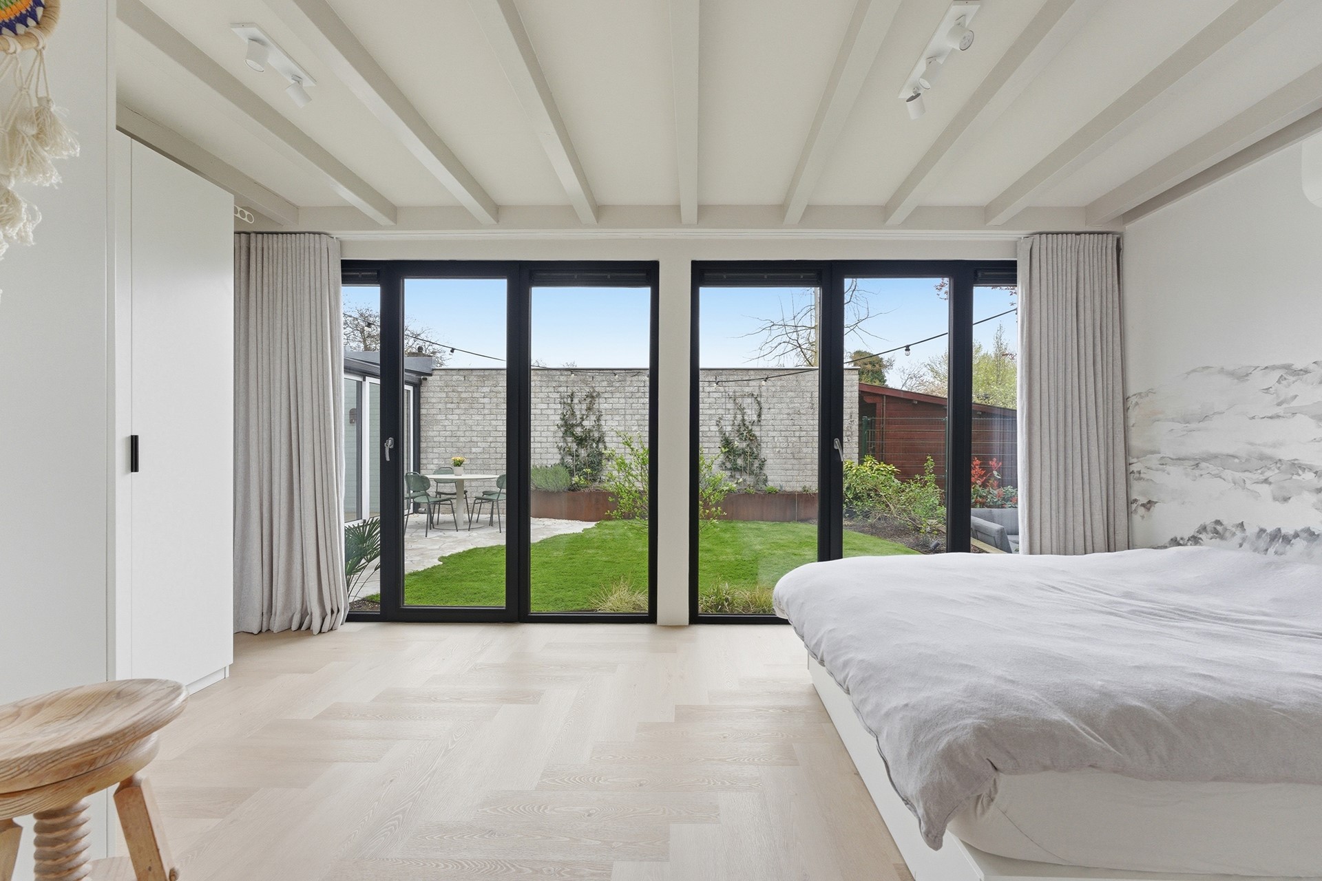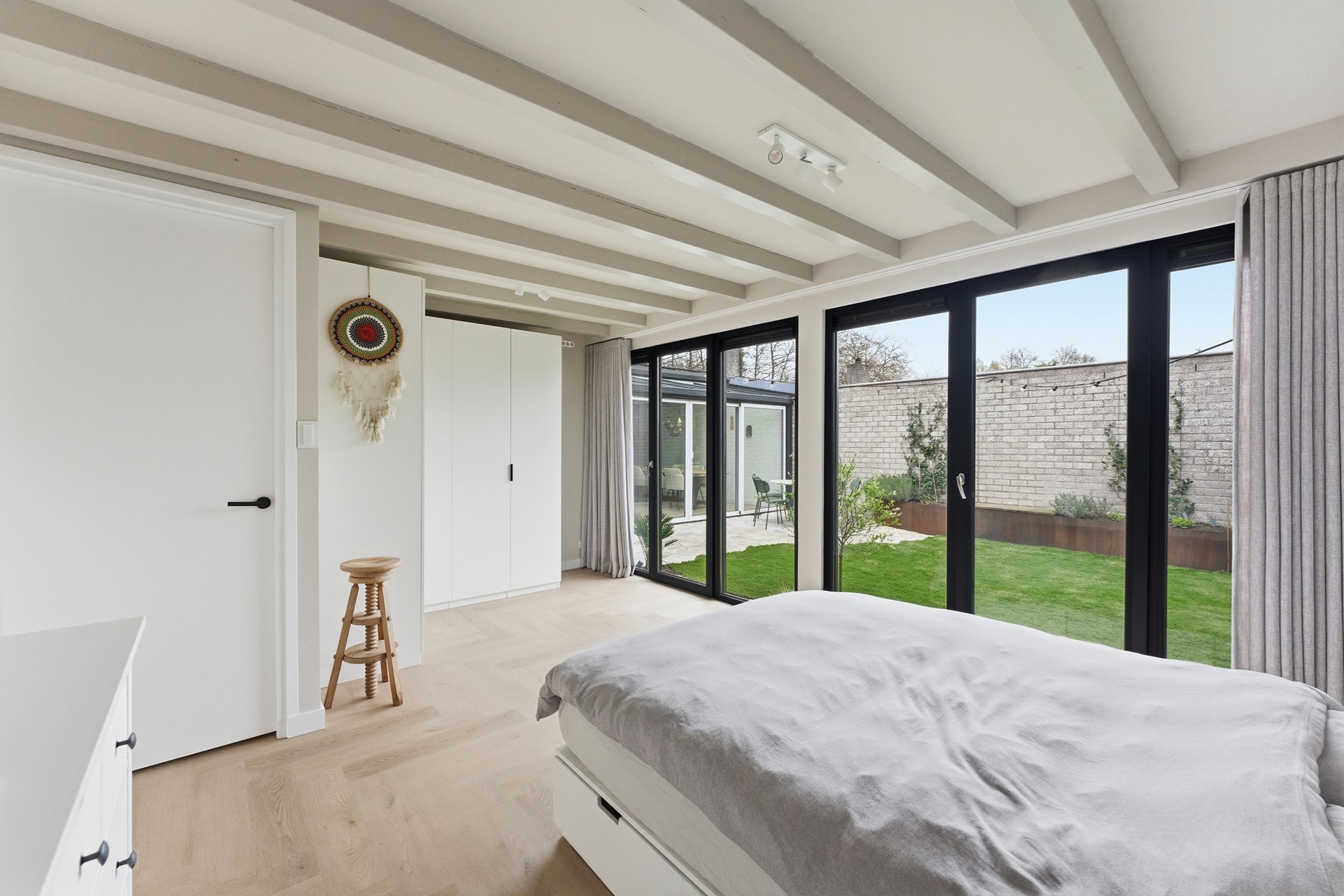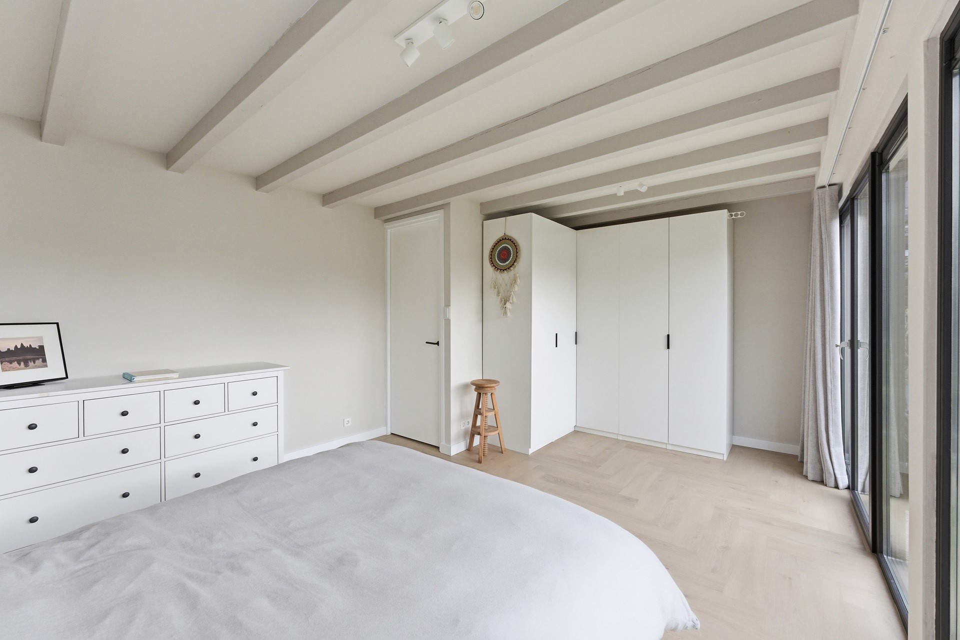 Slaapkamer 2: De tweede slaapkamer op de begane grond is zeer ruim opgezet en biedt door de huidige indeling de mogelijkheid om eenvoudig gesplitst te worden in twee aparte kamers. Deze kamer beschikt over een extra hoog plafond dankzij de in 2024 verhoogde dakconstructie. De kamer is ook voorzien van kunststof kozijnen met triple beglazing.