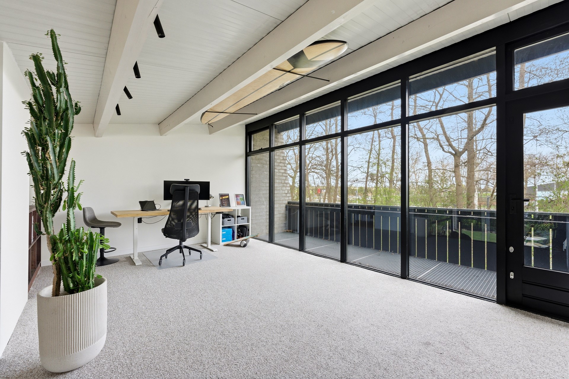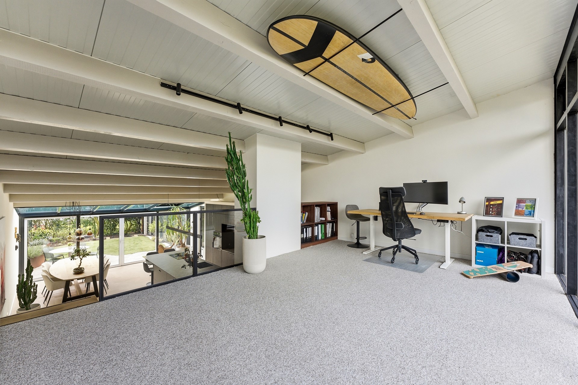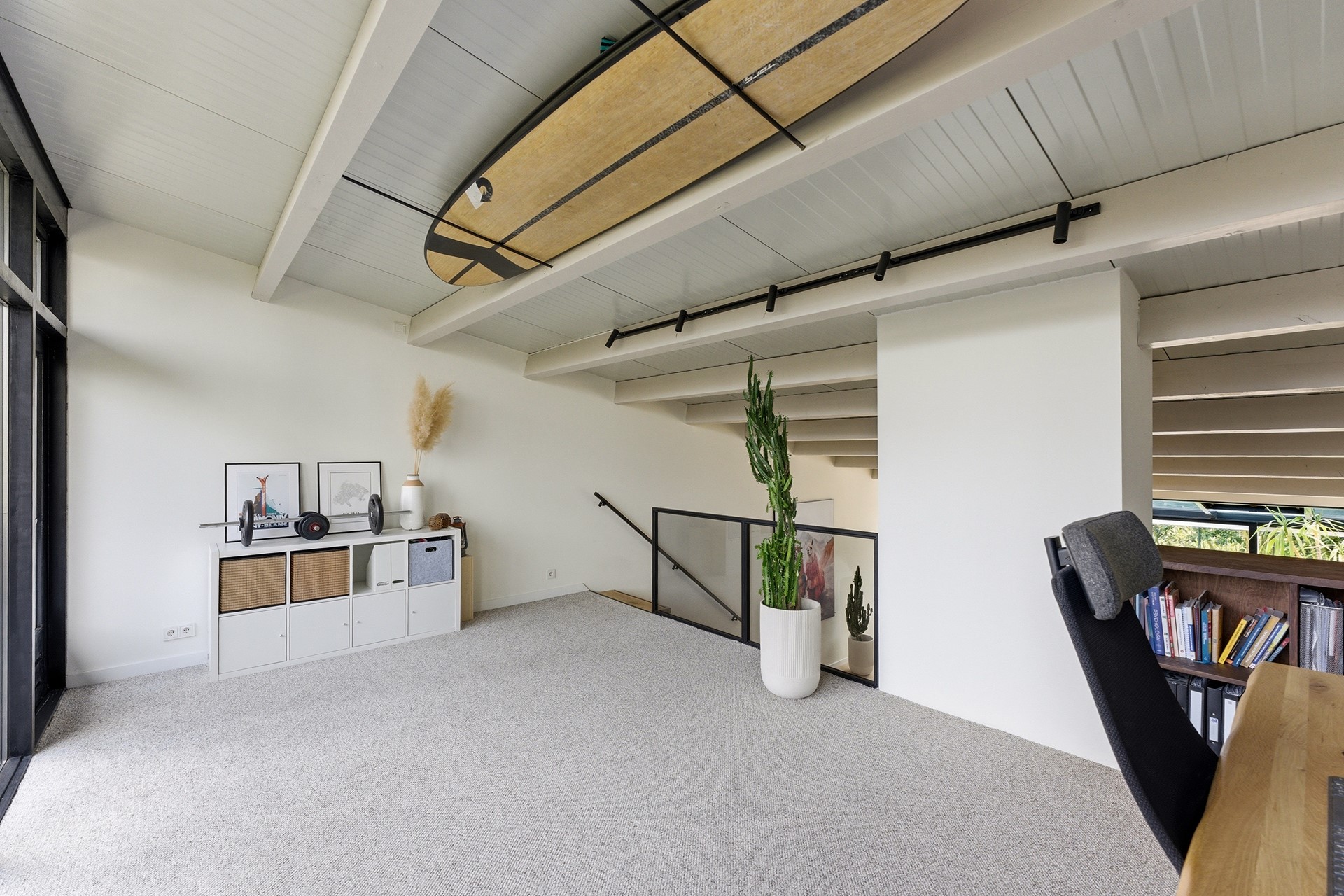 Vide: De vide is bereikbaar via de prachtige trap in de woonkamer en biedt een unieke blik over de gehele leefruimte beneden. Momenteel is deze lichte ruimte ingericht als werkplek, met directe toegang tot het grote balkon aan de voorzijde. Door de open verbinding en de grote raampartijen voelt dit als een inspirerende plek om te verblijven. De wanden zijn strak gestuukt en de vloer is afgewerkt met PVC.