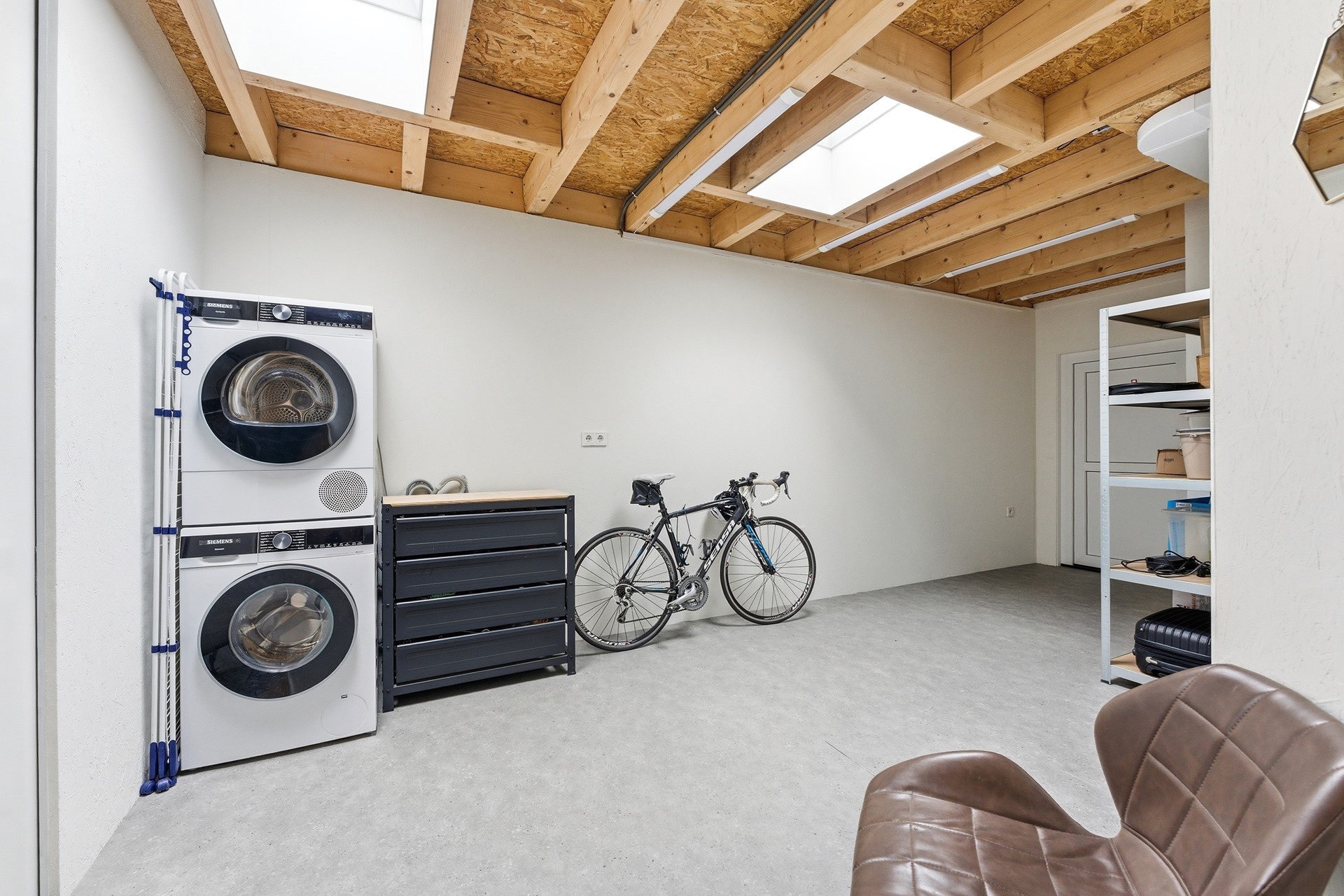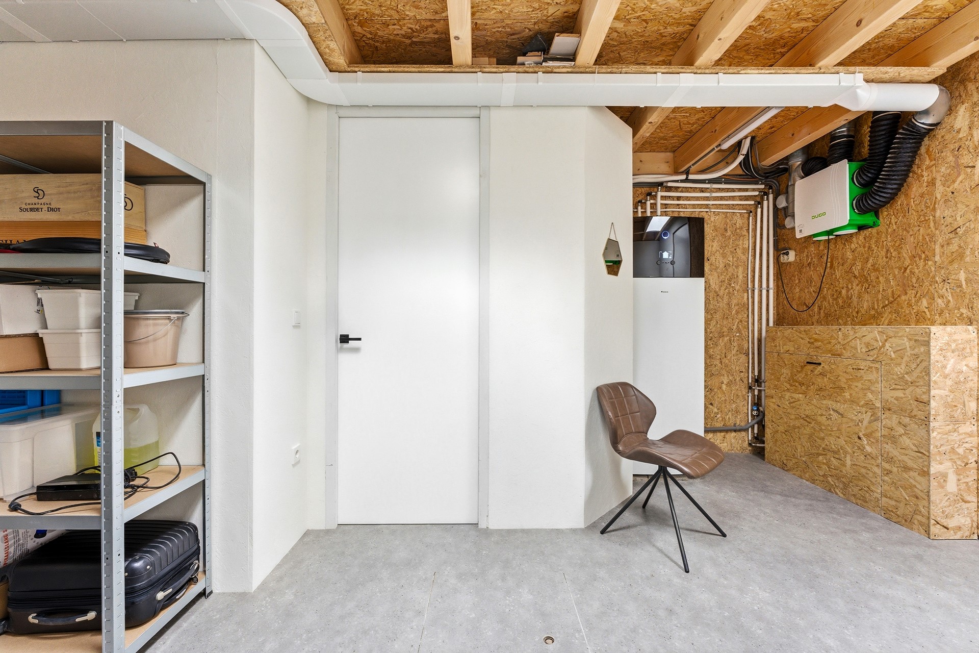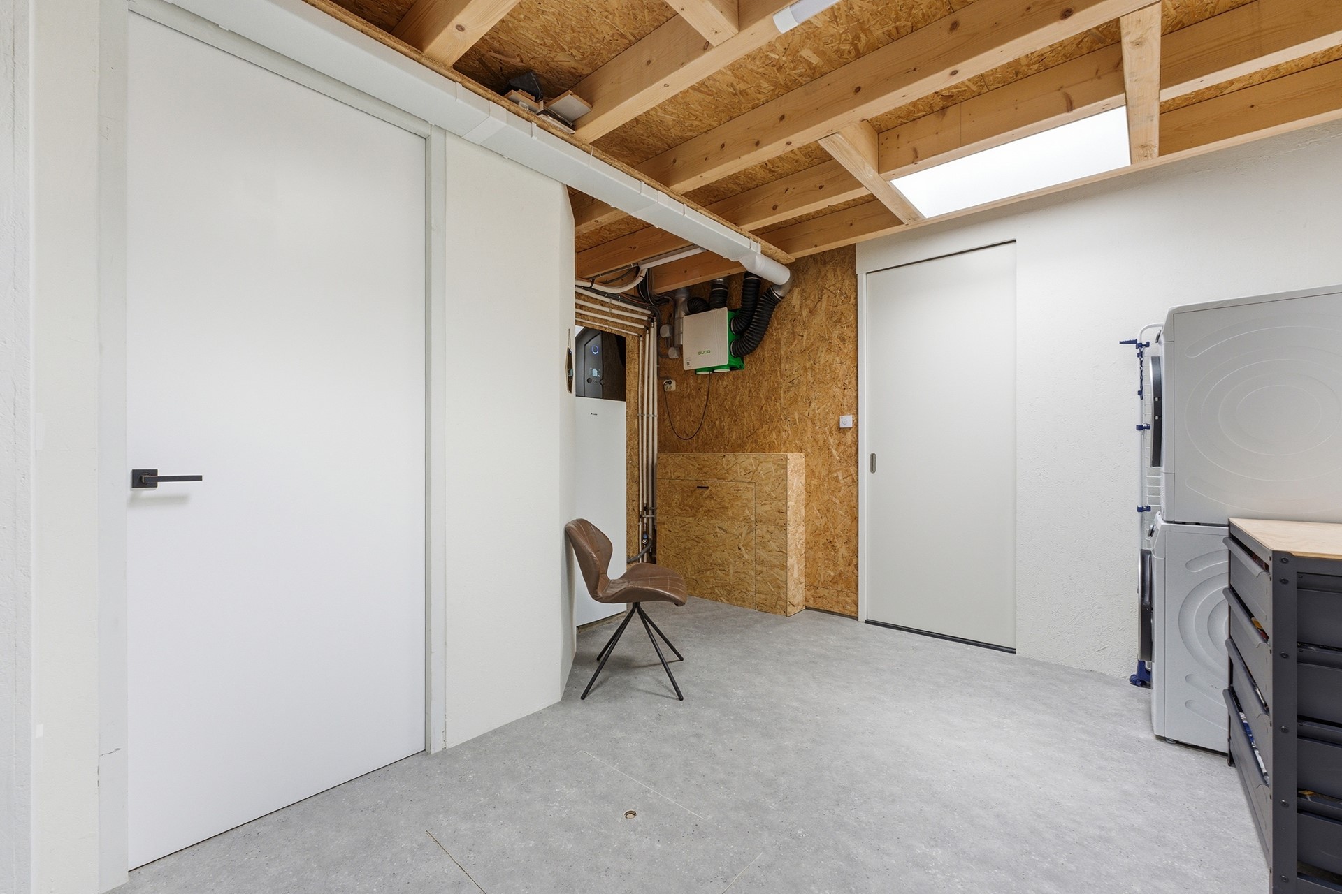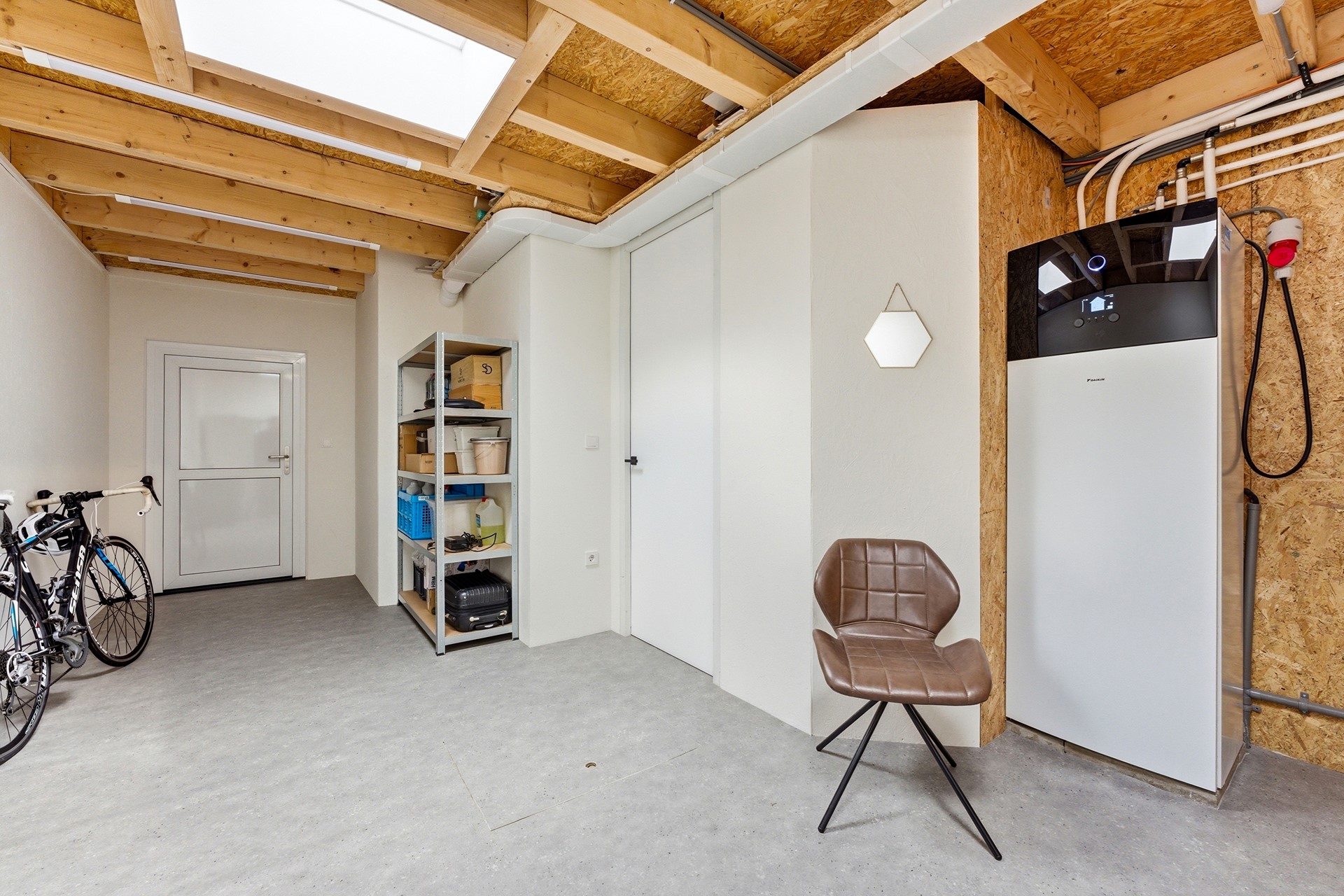 Berging: De inpandige berging is bereikbaar vanuit de hal en herbergt de technische installaties, waaronder de Daikin warmtepomp (2024) en de 230 liter boiler. Hier bevinden zich tevens de aansluitingen voor de wasmachine en droger. De ruimte is voorzien van een dakraam, vloerverwarming en een deur die direct toegang geeft tot de oprit.