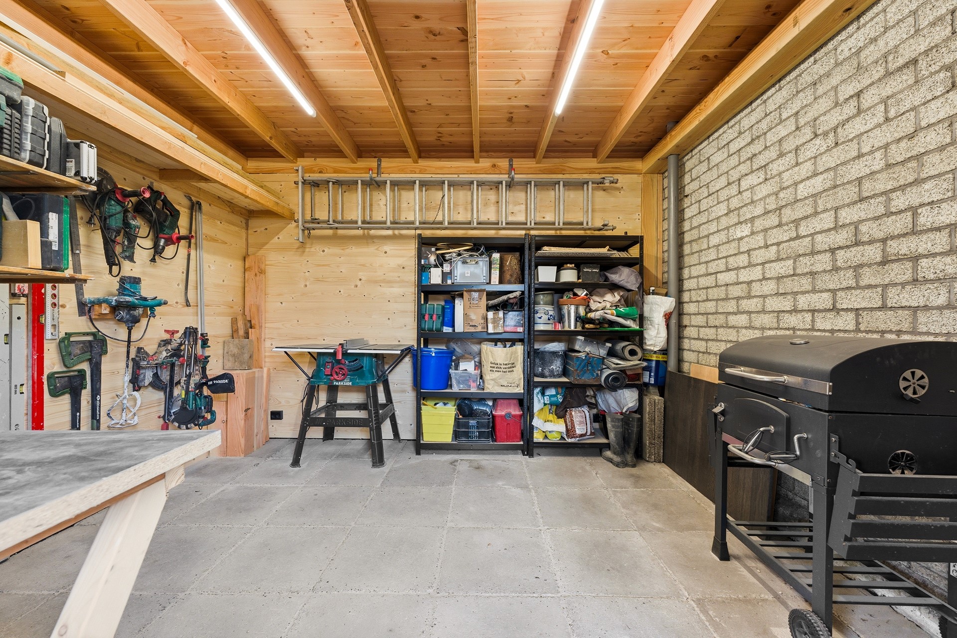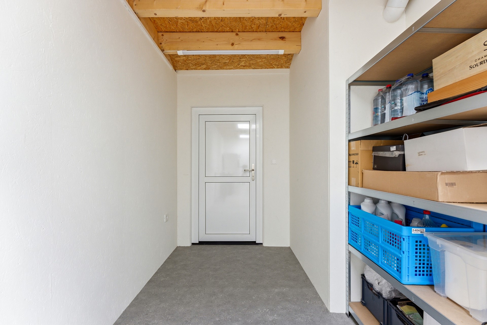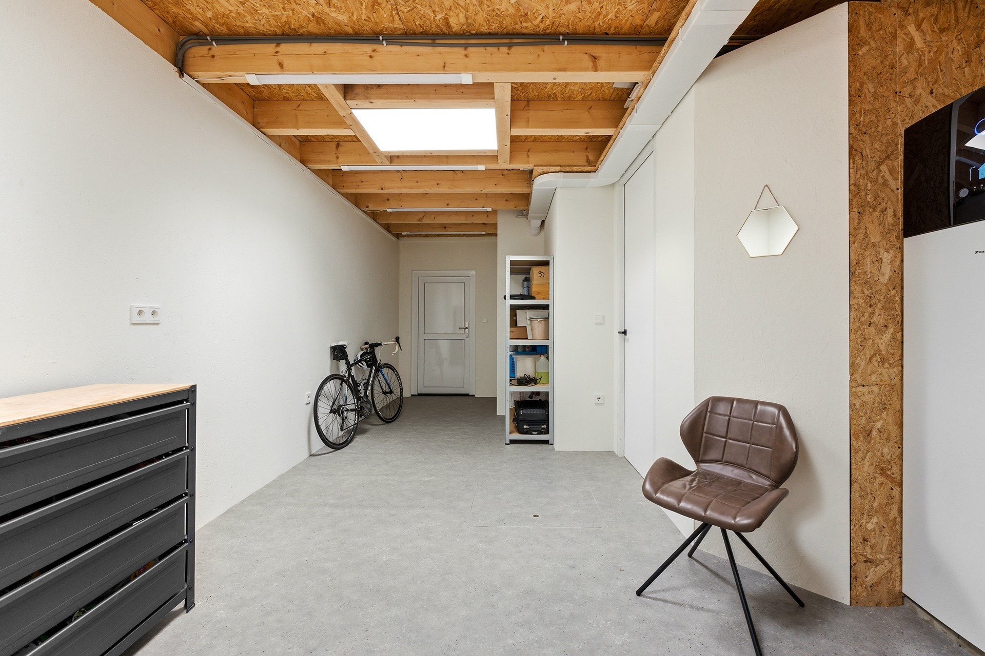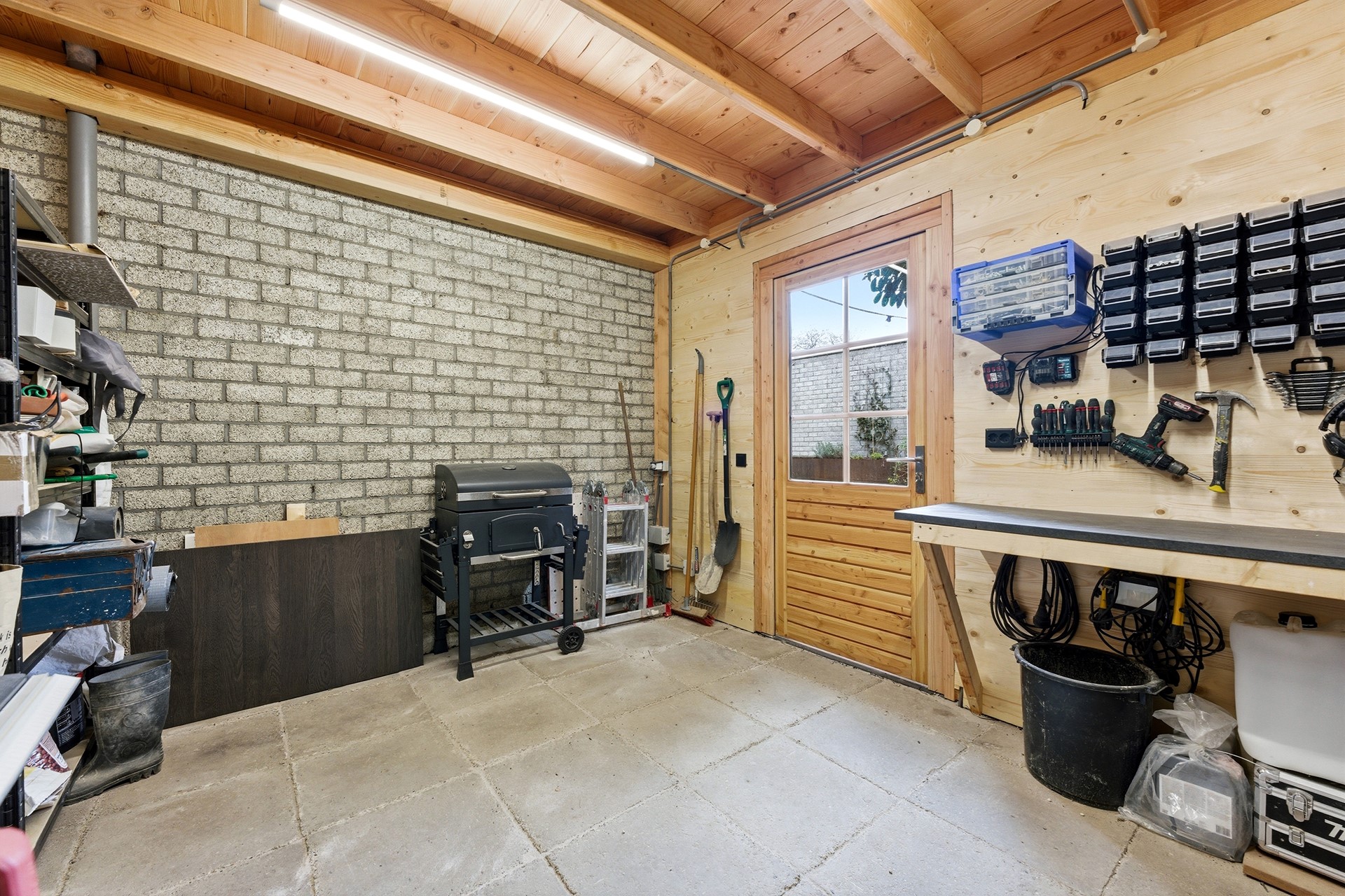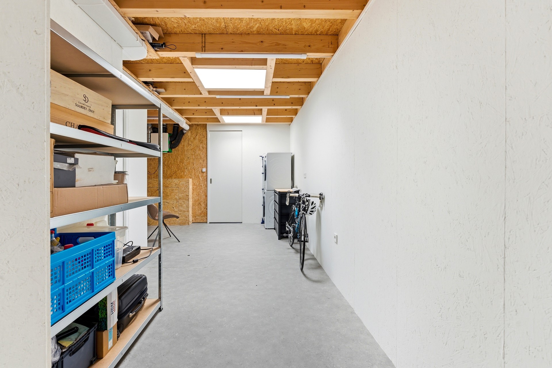 Berging: De inpandige berging is bereikbaar vanuit de hal en herbergt de technische installaties, waaronder de Daikin warmtepomp (2024) en de 230 liter boiler. Hier bevinden zich tevens de aansluitingen voor de wasmachine en droger. De ruimte is voorzien van een dakraam, vloerverwarming en een deur die direct toegang geeft tot de oprit.