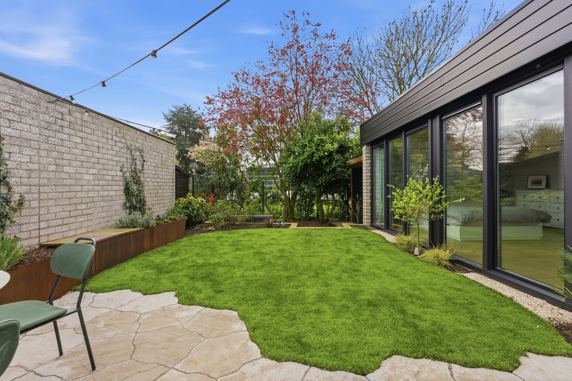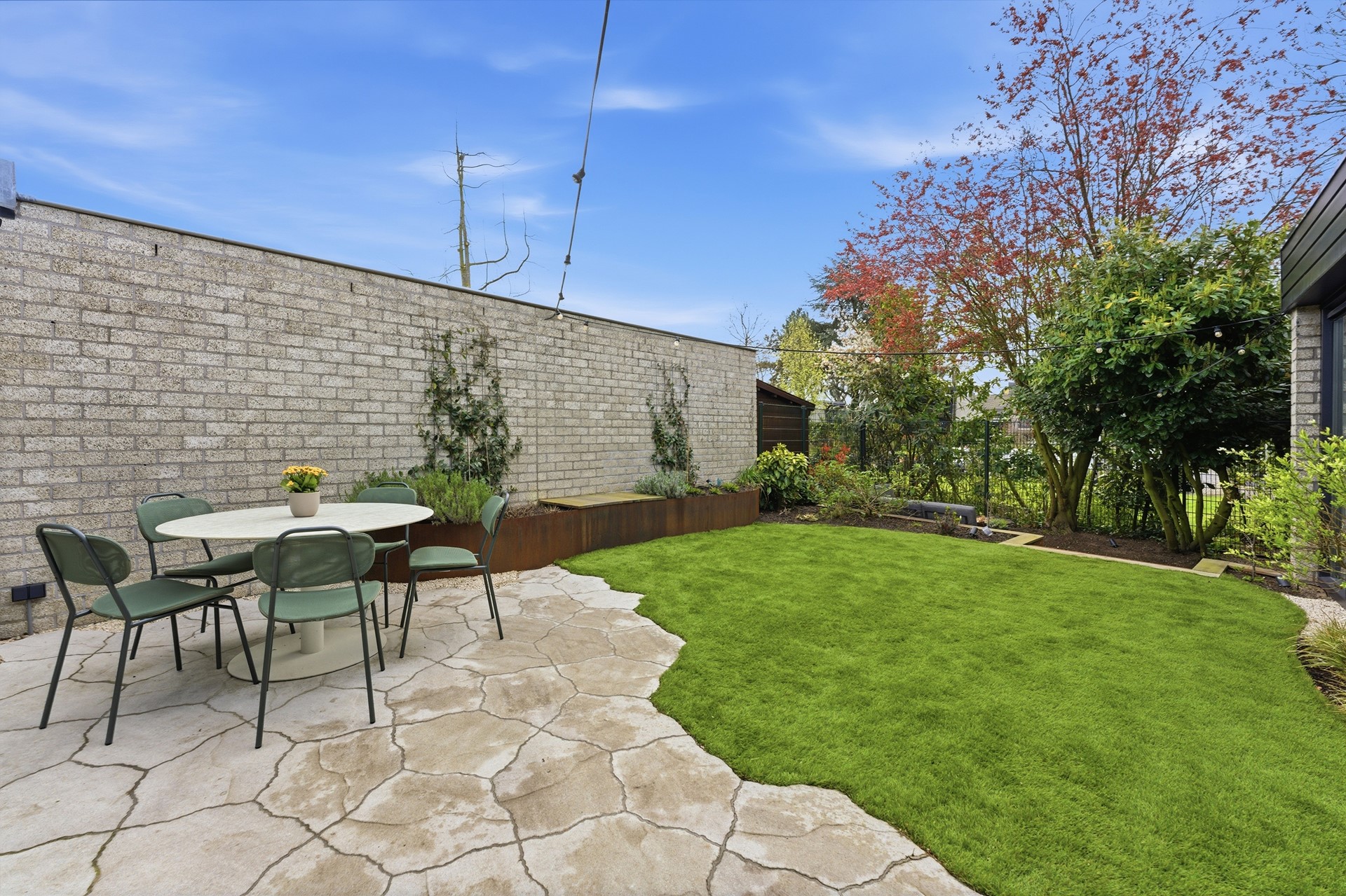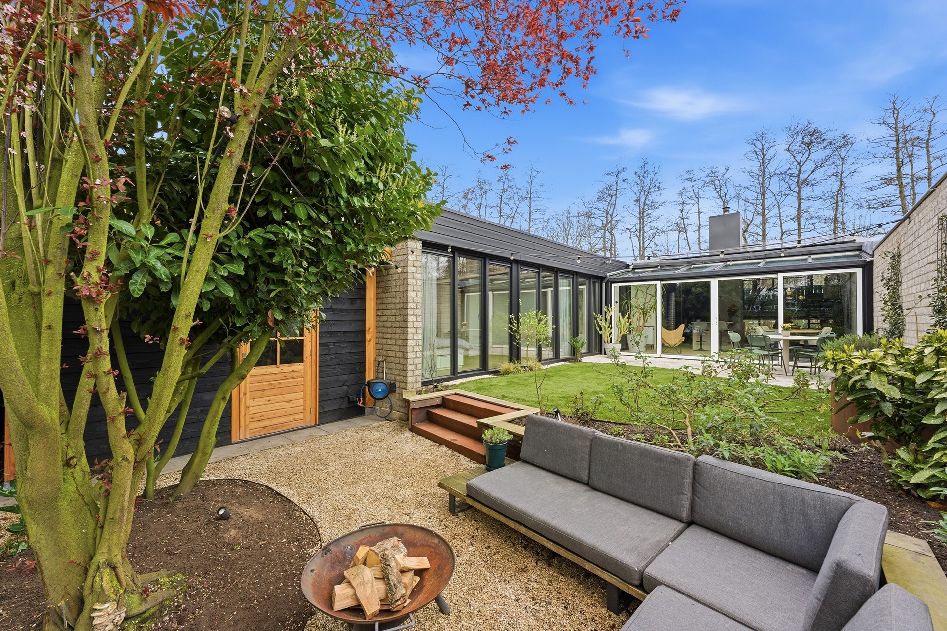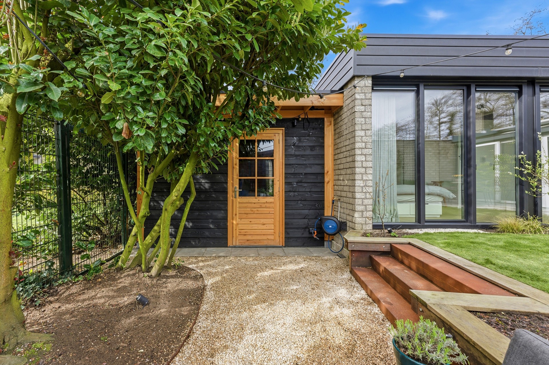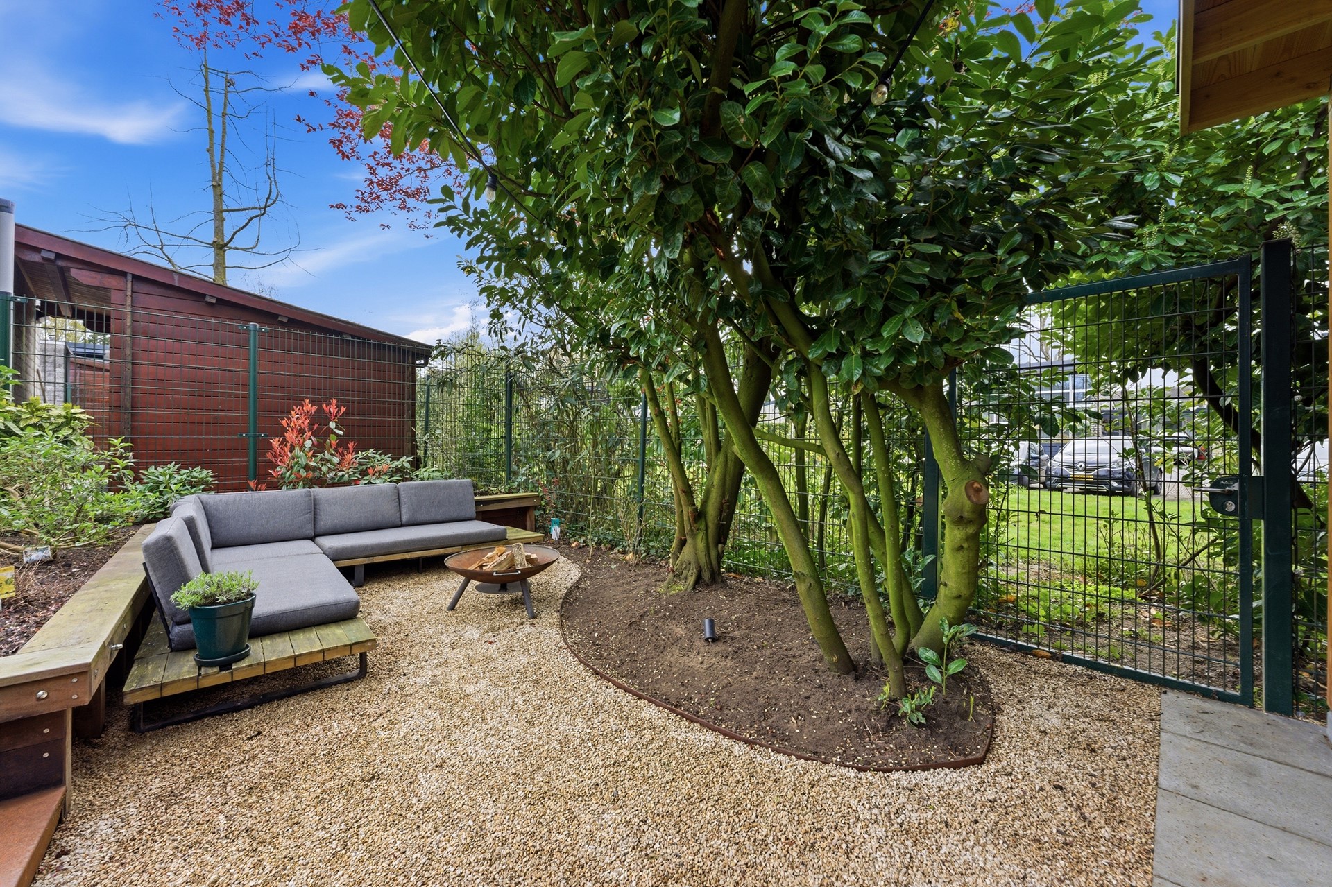 Achtertuin: De zonnige achtertuin op het zuiden is recent aangelegd en biedt een sfeer die doet denken aan een vakantieverblijf. Het is een leuke en gezellige buitenruimte, verzorgd ingericht met sierbestrating, kunstgras, grind en moderne elementen van cortenstaal, omgeven door mooie beplanting. Een absoluut hoogtepunt is de knusse zitkuil, de perfecte plek voor lange zomeravonden rondom een knisperende vuurschaal. Dankzij de handige achterom is de tuin ook met de fiets goed bereikbaar. De aanwezigheid van een buitenkraan en elektrapunten maakt deze tuin compleet.