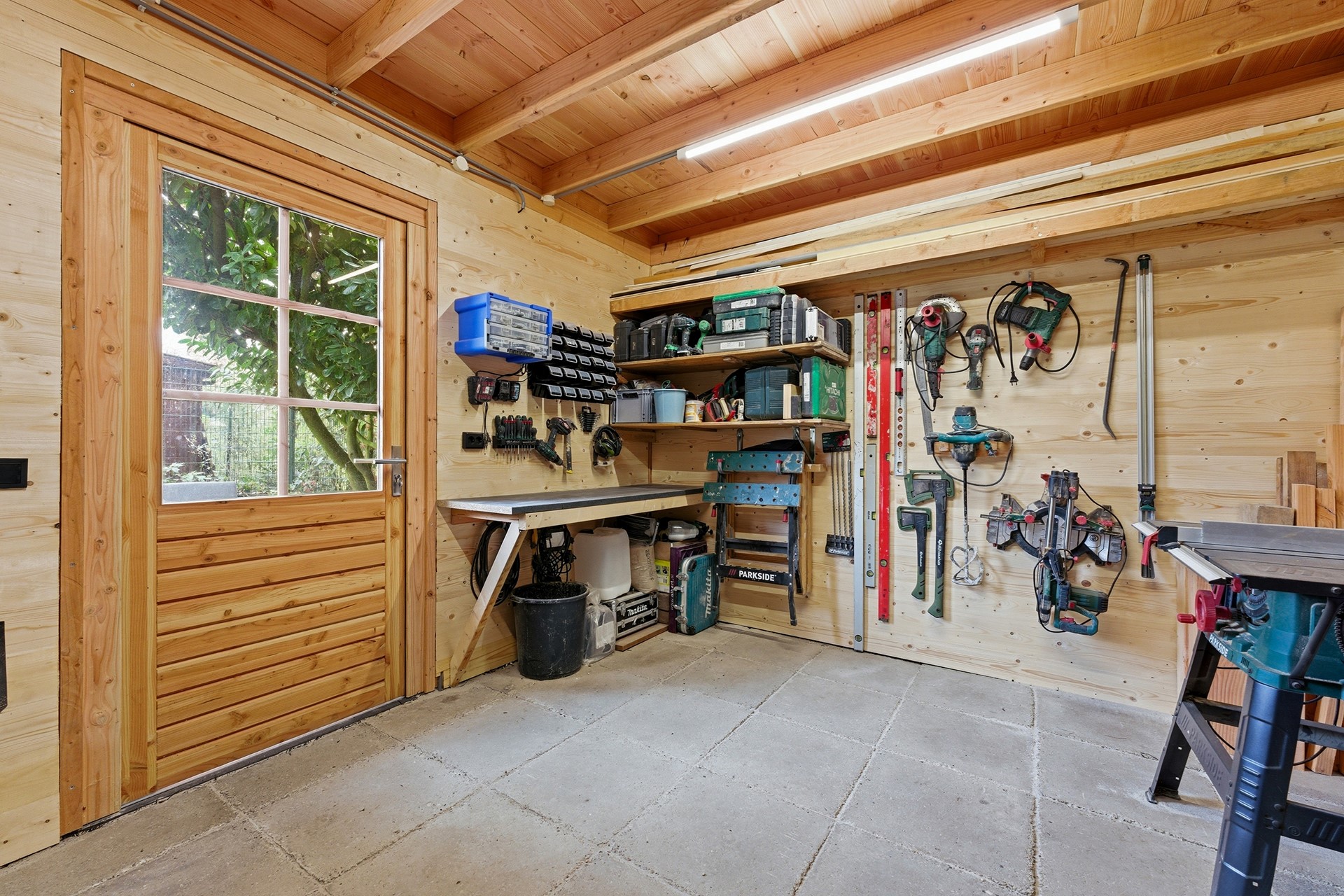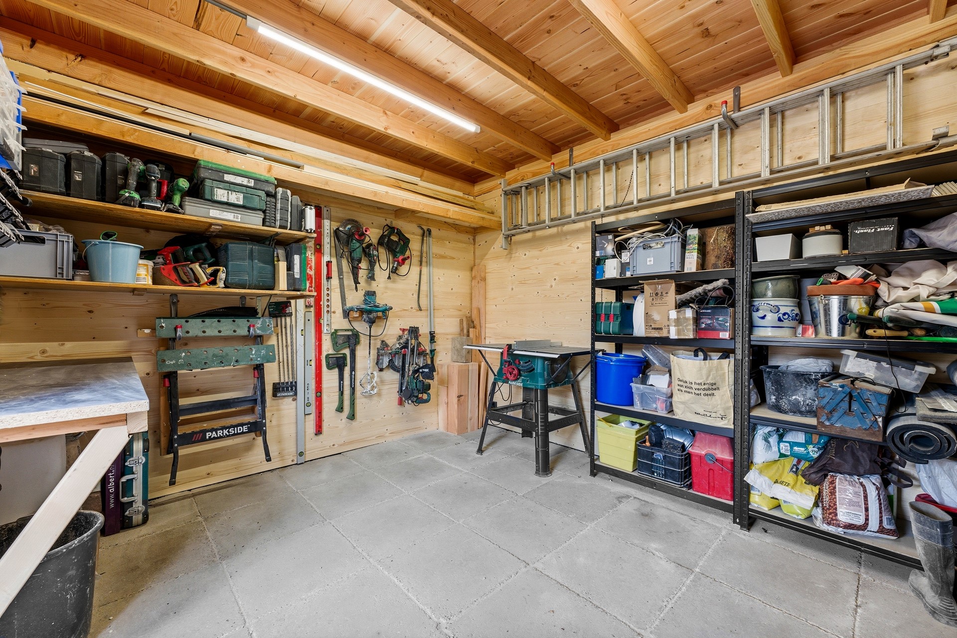 Schuur: In de achtertuin bevindt zich een royale, vrijstaande houten schuur met een opvallende nokhoogte. De schuur is voorzien van elektra en biedt uitstekende mogelijkheden voor opslag.